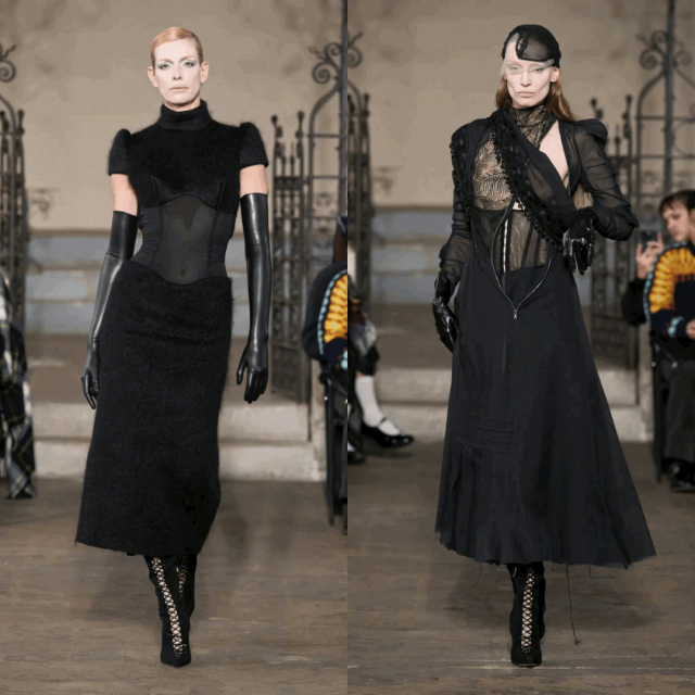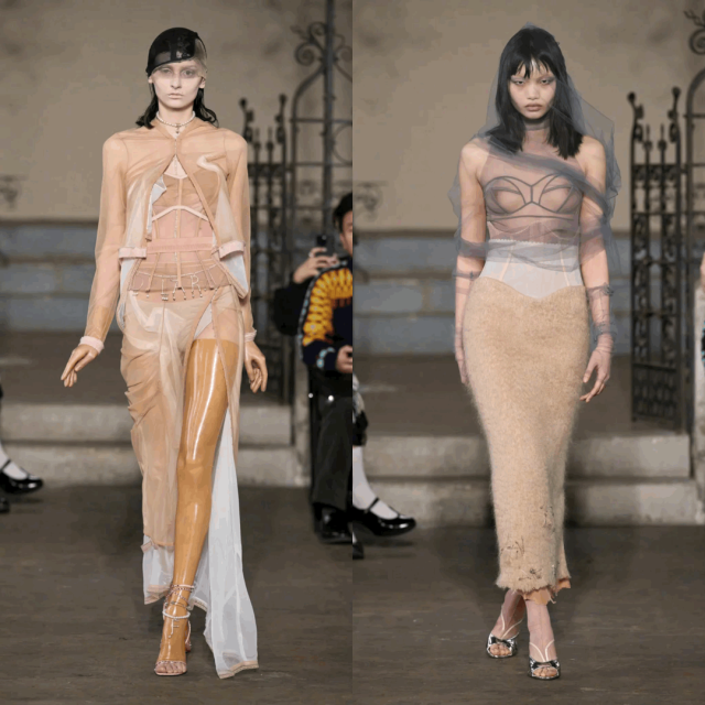 极致诱惑的女战士从Mugler的塑造中可见一斑,层次丰富且精致,大胆镂空与露肤,一如既往的犀利设计,鱼骨胸衣在这里被玩儿明白了。