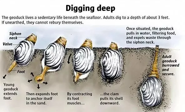 象拔蚌的英文俗名叫Geoduck,有“深挖”的含义,顾名思义它们喜欢栖息于泥沙质浅海海底或潮间带,能将自己埋藏于一米深的泥沙中,靠伸出粗壮的虹吸管与外界进行物质交换。象拔蚌于幼年时利用出入水管对侧的足将自己逐渐埋入泥沙内固定,因为象拔蚌的足高度退化,相对于成体的比例较小,一但“扎根”,成年后则无法再次“挪窝”
