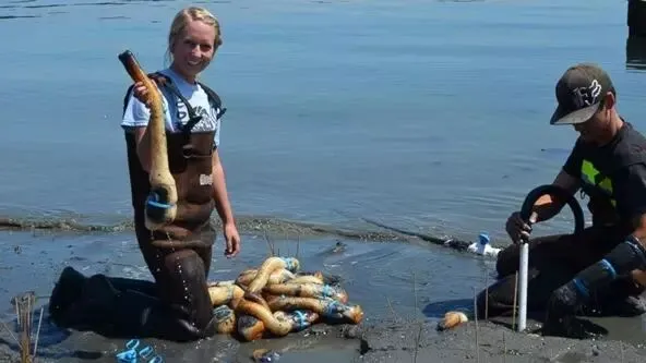 象拔蚌深埋于泥沙之下,要捕捉到它可是个体力活儿。人们寻觅到象拔蚌露出泥沙外的虹管的踪迹后,便会用随身携带的高压水枪冲掉象拔蚌上方厚达一米的泥沙,直到挖出象拔蚌,对于栖息在海底的象拔蚌,这一切则需要在潜水状态下完成。