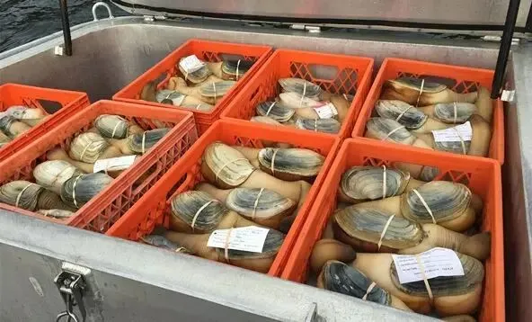 潮下养殖更像是对于自然资源的补充,人工繁育象拔蚌幼苗,长到一定规格后再播撒到象拔蚌允许捕捞的水域,使该水域的象拔蚌资源得到更快速的恢复。因为成年象拔蚌一旦从洞穴中挖出来,再放回大海就无法继续存活。因此潜水员在海底捕捞上来的象拔蚌,不论大小都必须上岸,不允许丢回海中。