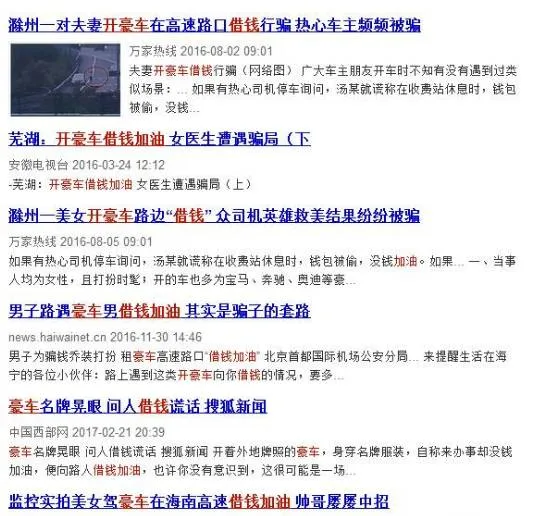 小编在网上搜了一下,发现近年来,全国各地相继有关于在高速路边拦车借钱诈骗的报道。