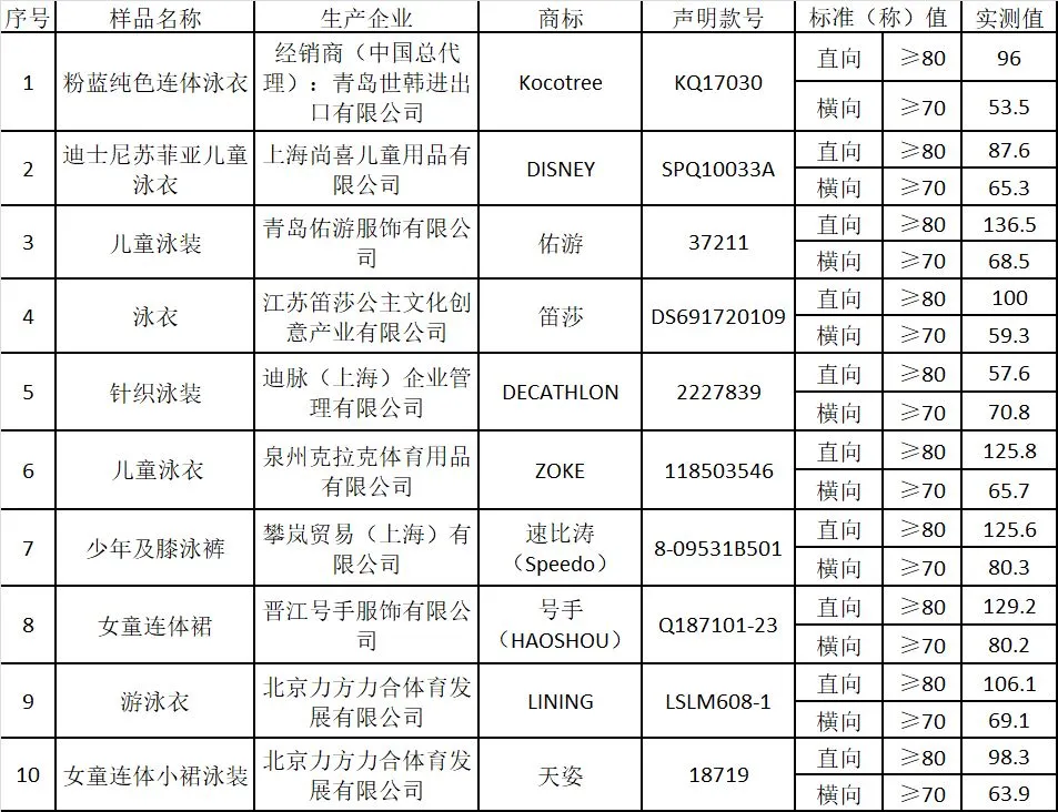 李宁牌游泳衣涉及产品使用说明不符合标准、拉伸强度不符合标准等两项问题。迪士尼牌儿童泳衣和迪卡侬牌针织泳衣的拉伸强度不符合标准。