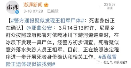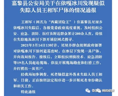 昨日,官方通报疑似发现冰川哥的遗T:身份正在确认,3月14日13时许巡查时,在冰层下发现一具s体,