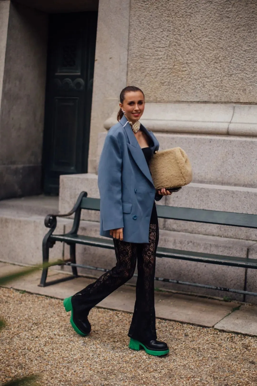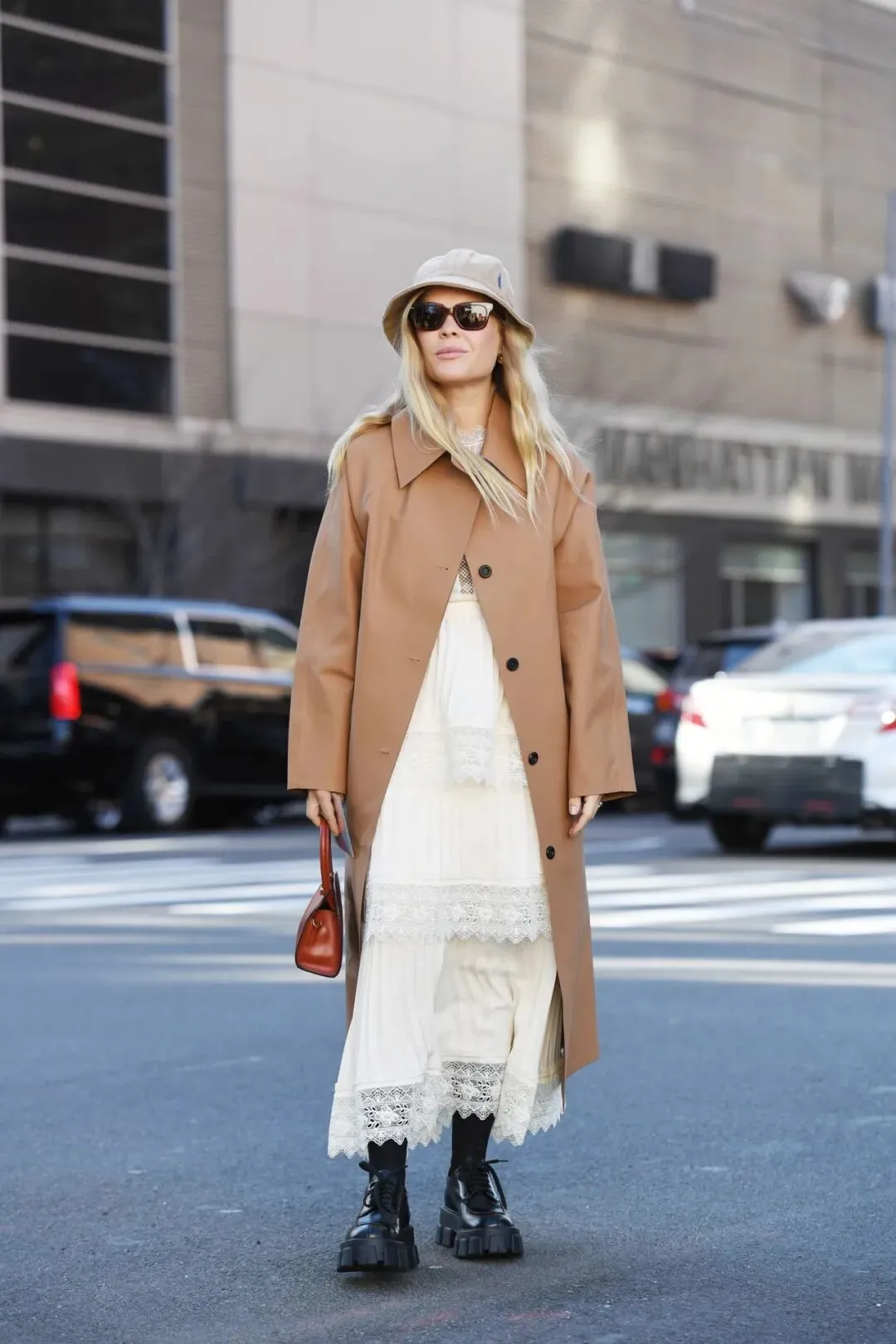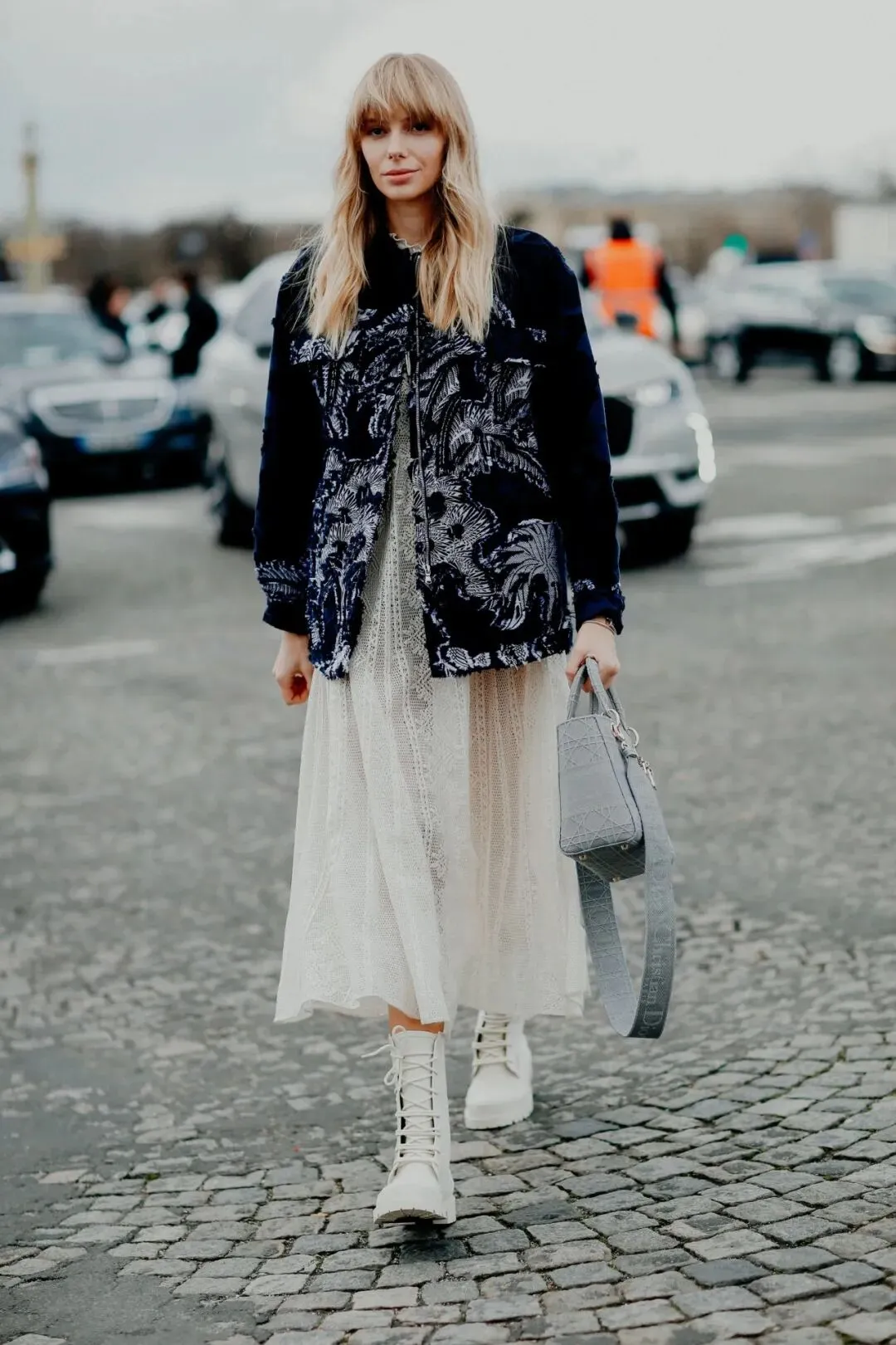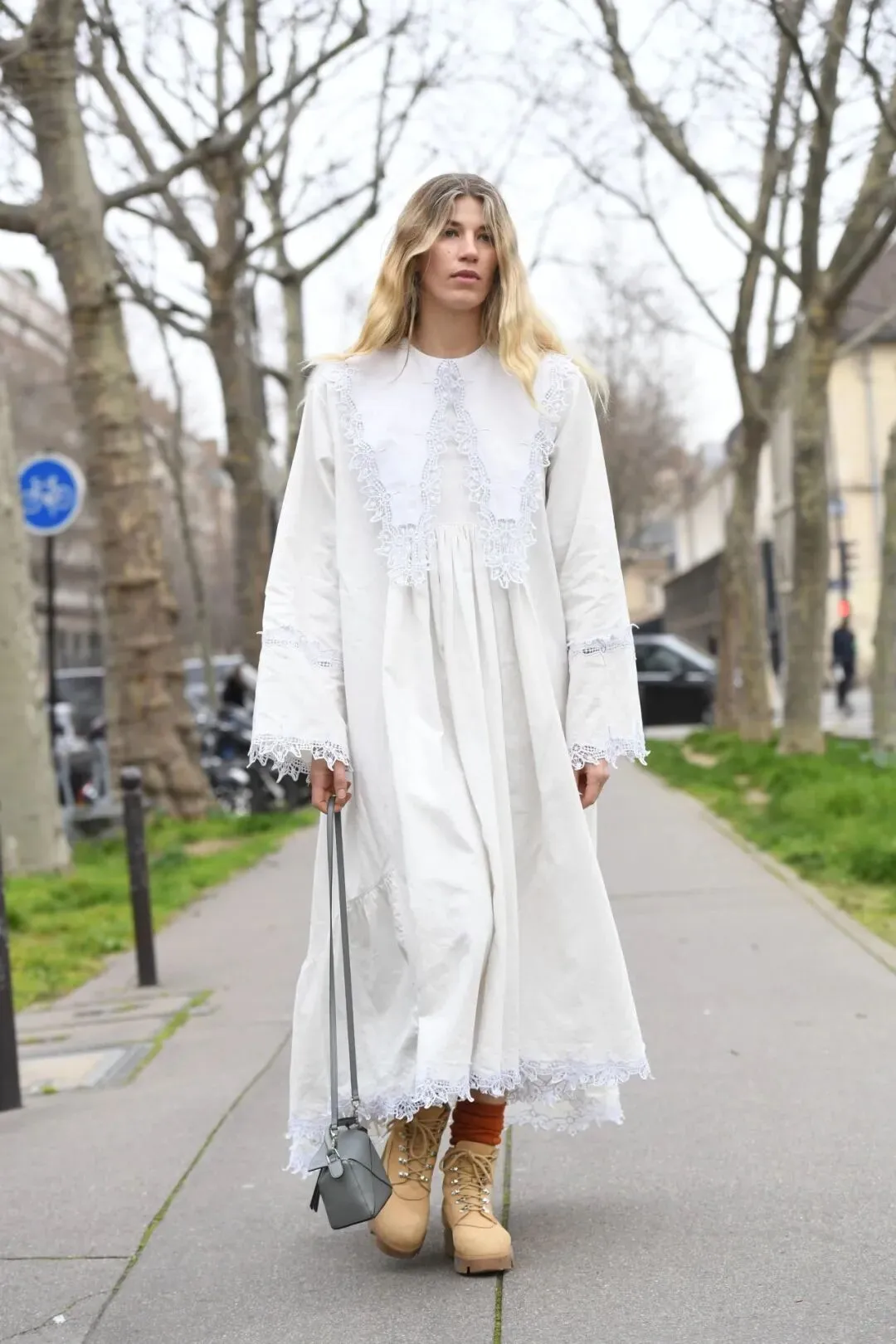 长外套,特别是过膝的设计,与蕾丝连衣裙相结合,带来了一种欧洲复古的优雅。连衣裙下摆在外套下隐隐约约,仿佛在玩一个时尚的捉迷藏。