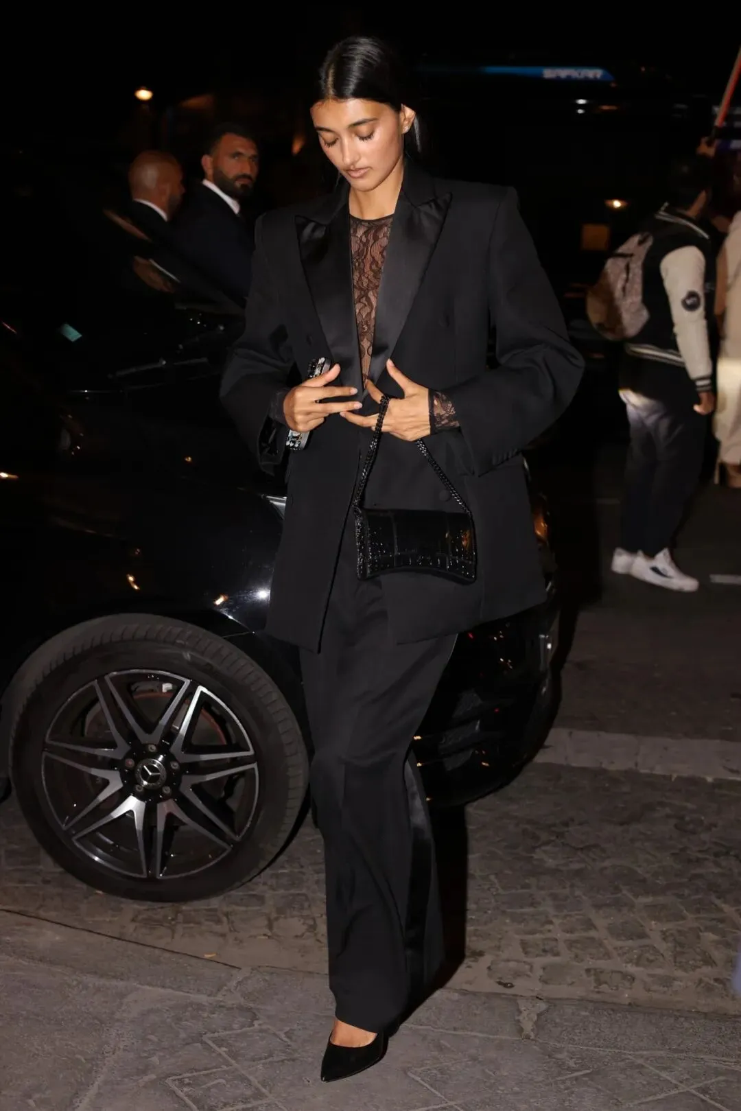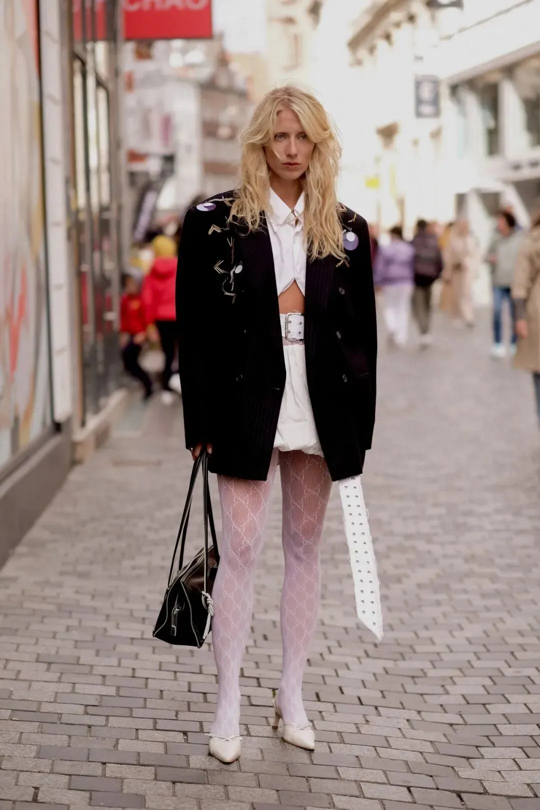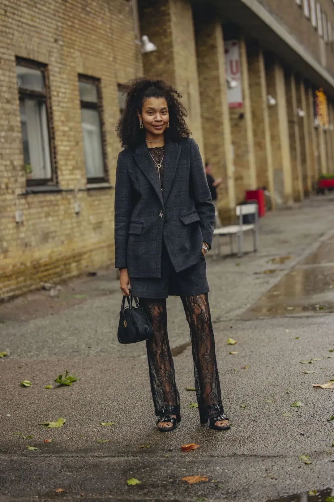 裤袜的蕾丝花纹为裸露的腿部增加了层次感,而西装外套则为整体造型增添了一份正式感。当然,蕾丝长裤同样也可以达到这样的效果,相比袜子来说更休闲一些。