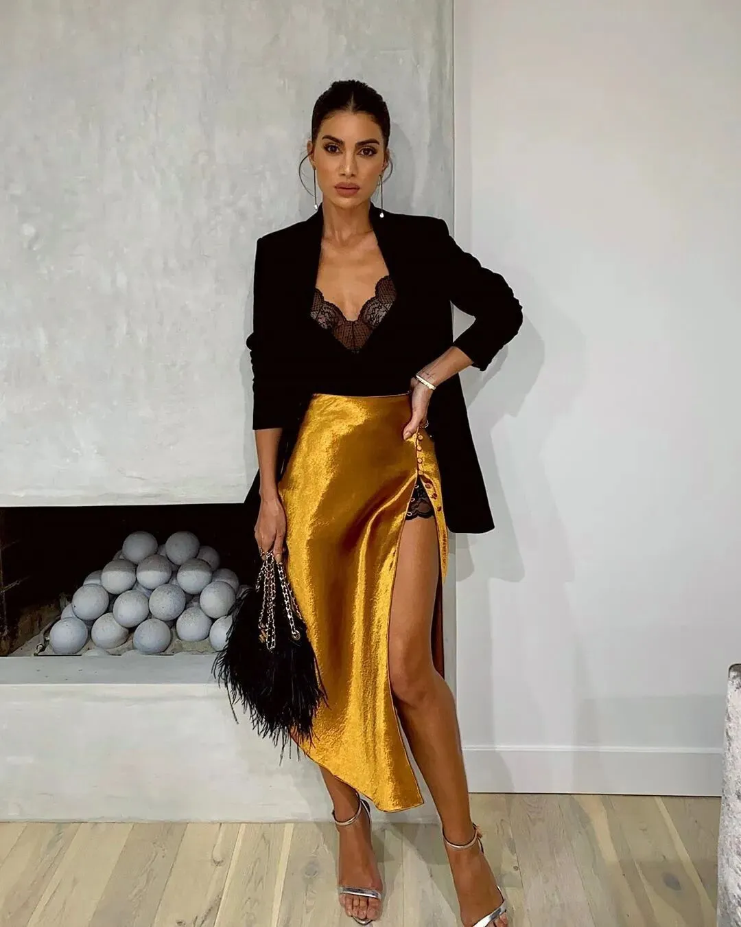 想要让整体更潇洒一些,就搭配成套的干练裤装。如果想要更女人味一些,像这样的丝绸质感贴身半裙是很好的选择,秋季依旧可以尝试开衩这样的性感款式。