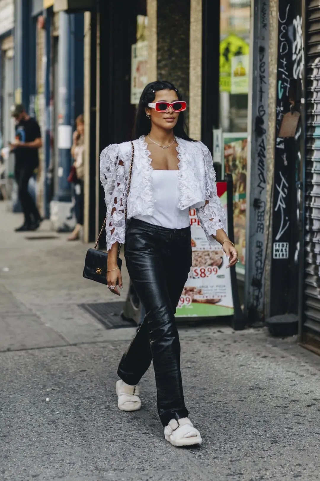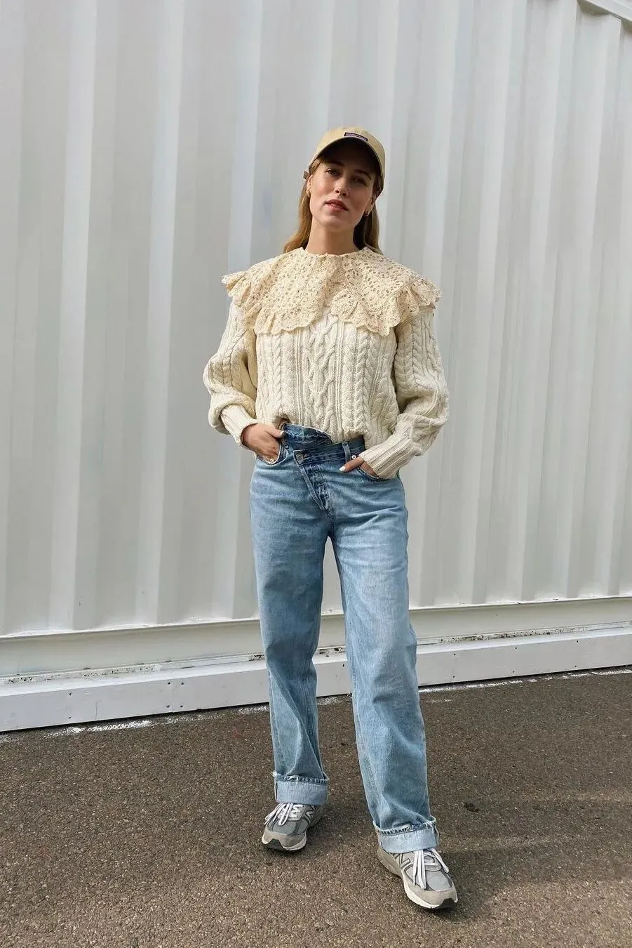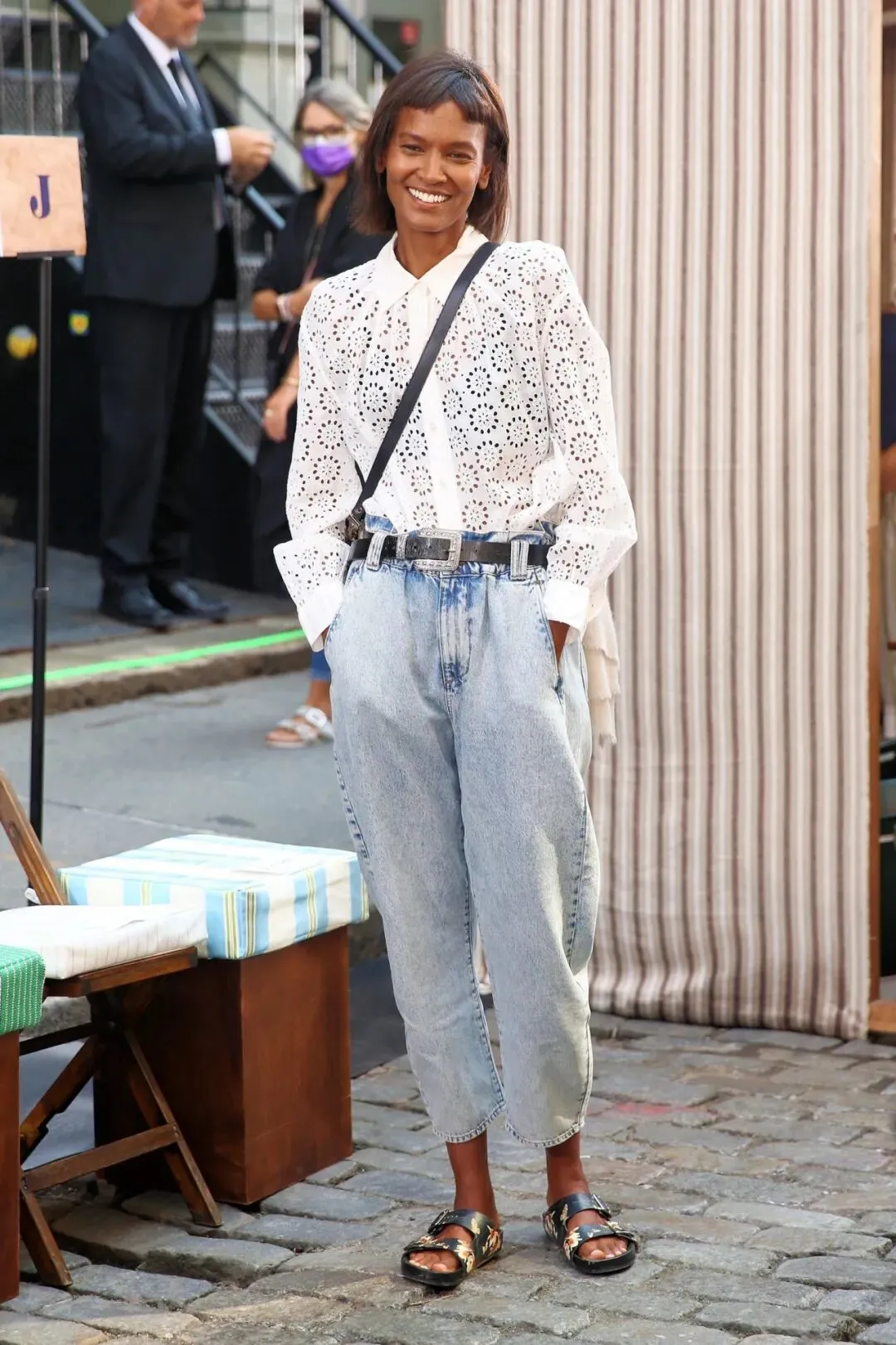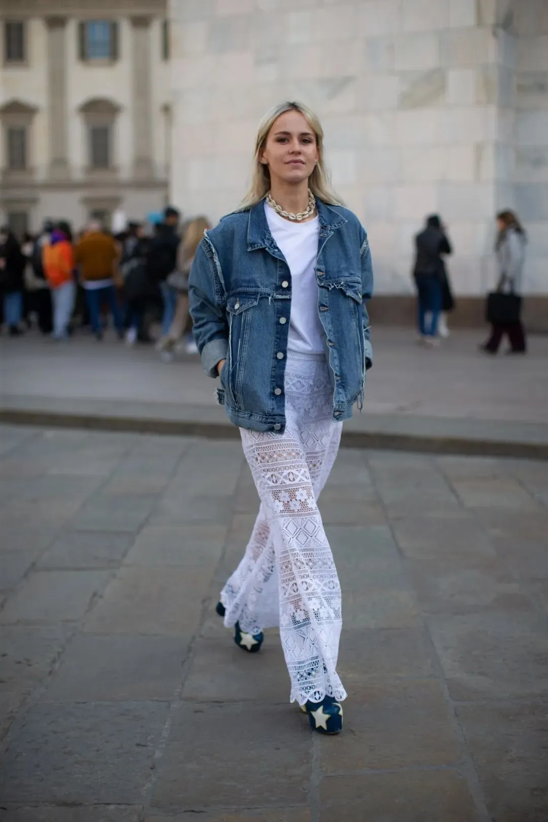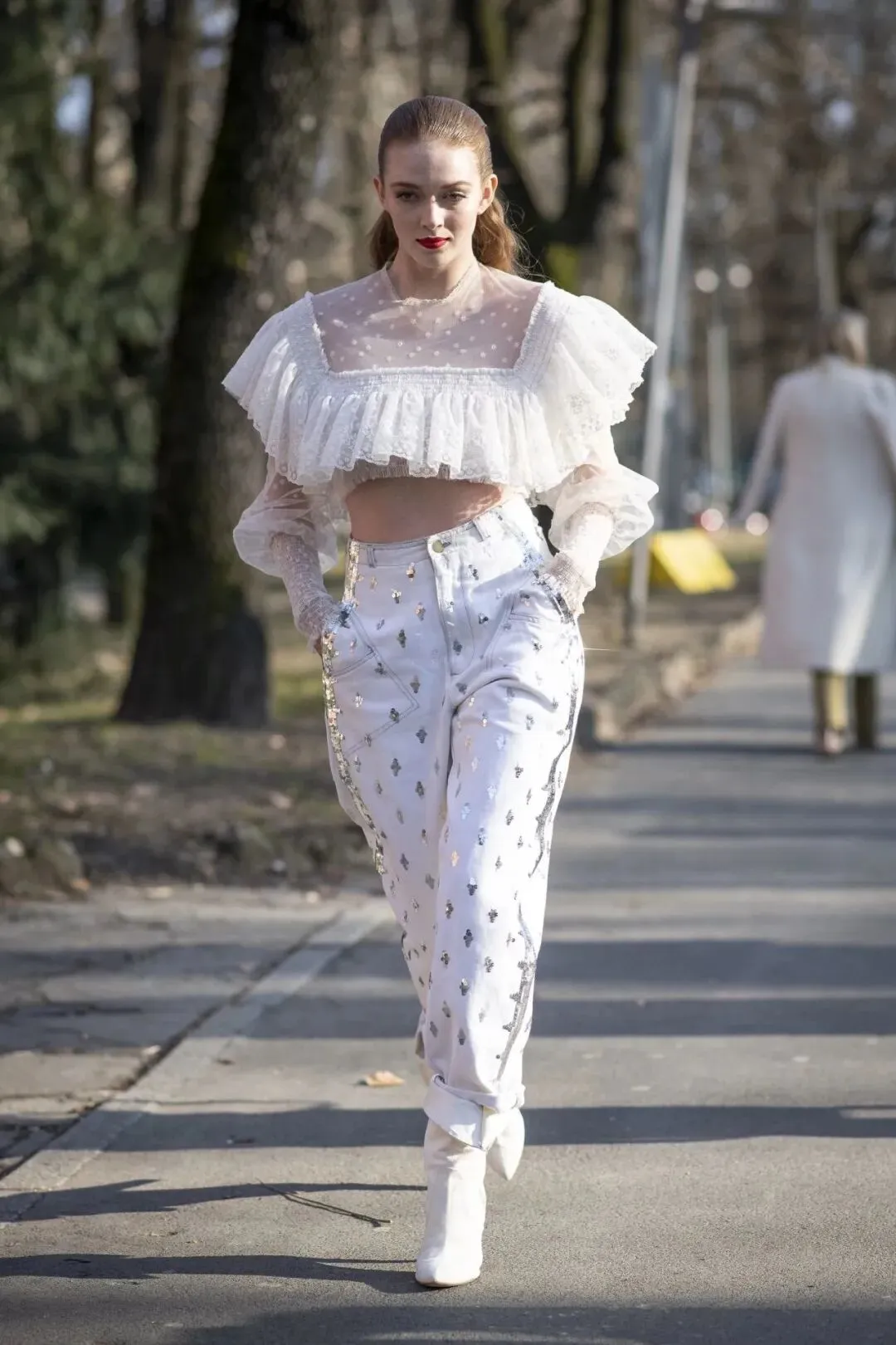 无论是宽松的老爹裤还是修身的小脚裤,都能与蕾丝上衣产生化学反应。鞋履上,一双小白鞋或是复古运动鞋会是不错的选择,舒适且不失时尚感。