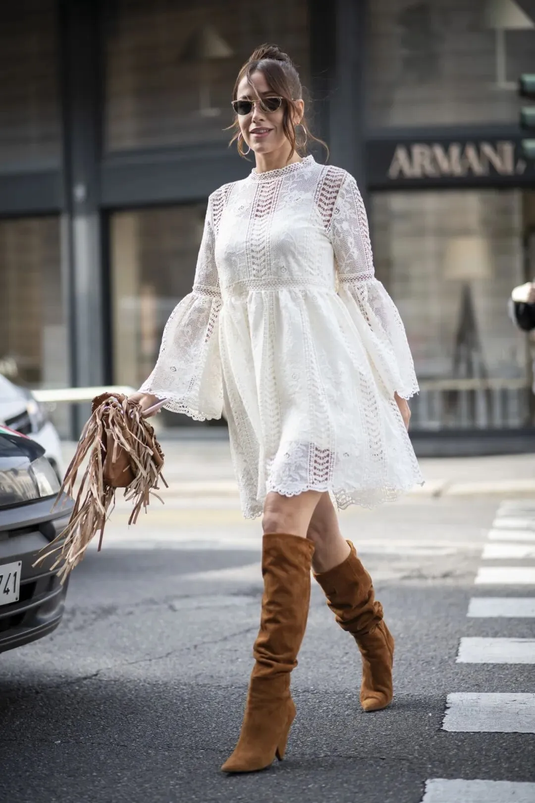 蕾丝连衣裙的细腻与靴子的个性呼应,让酷感和女人味在瞬间融合在一起。最能凸显这样感觉的,就是搭配黑色长靴。