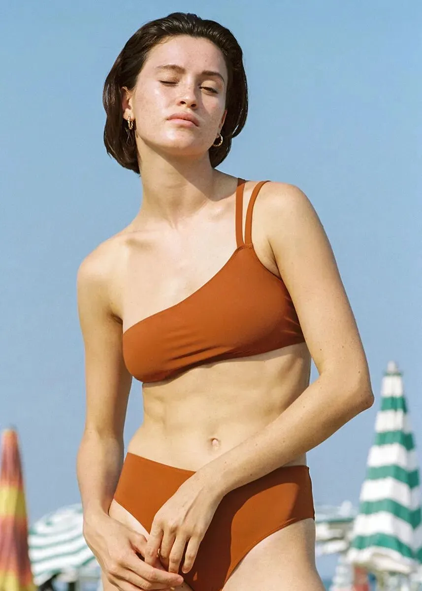 下面这件纽结裹胸泳衣也是今年的热门款式,可以很好地修饰身形轮廓,又不担心太暴露,舒适好穿。