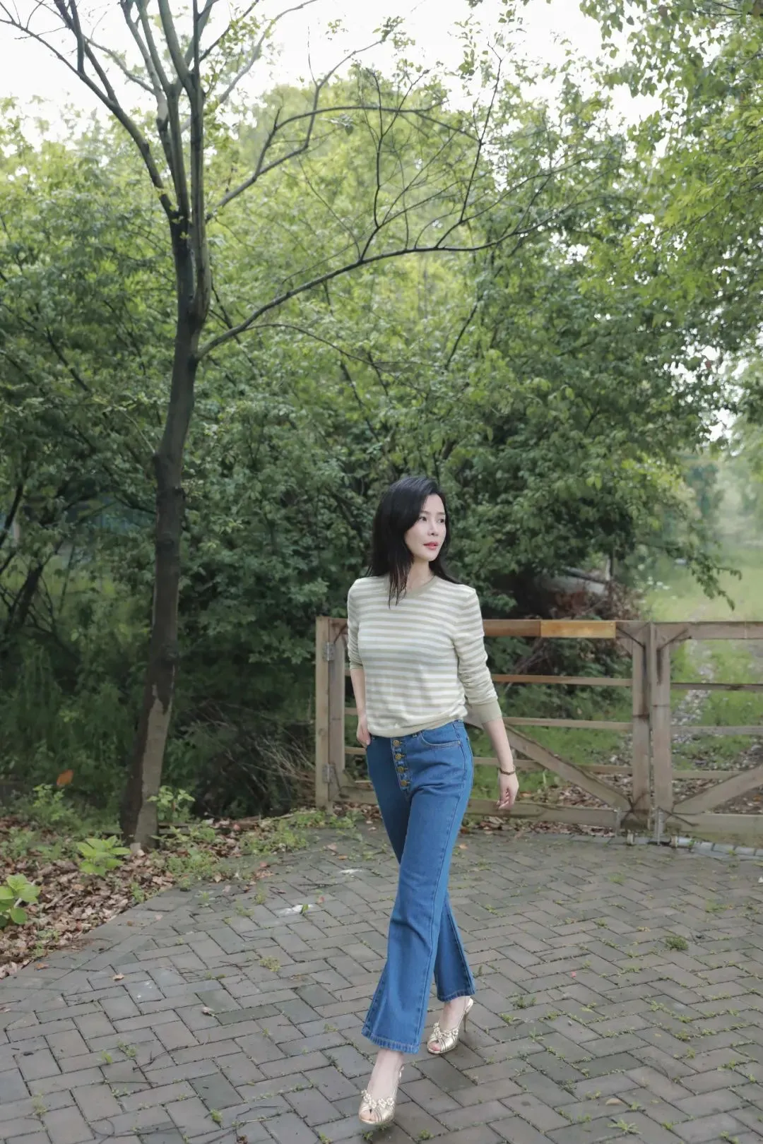 八分微喇牛仔裤也是春日度假好穿的单品。