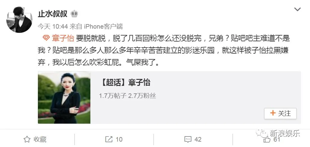 还有一个小插曲是该长篇大论决定脱粉的影迷,其身份并不是贴吧吧主。章子怡贴吧吧主@止水叔叔 在微博上回应这件事,看起来也是够气的:要脱就脱,脱了几百回粉怎么还没脱完?