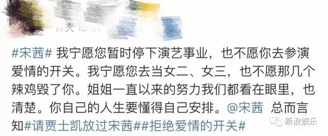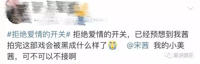 2017年夏天,网曝宋茜将出演电视剧《爱情的开关》,就被一大票粉丝发博抵制。原因是这部剧的原著小说有些三观不正,粉丝担心宋茜接了这部剧后,对她的路人缘不利。