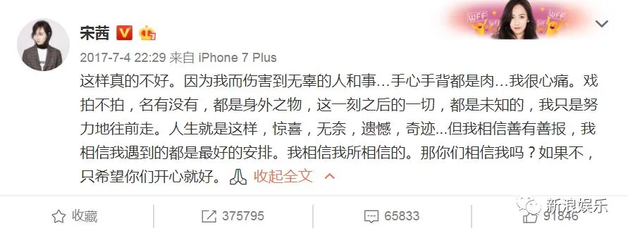 后来闹到宋茜不得不亲自发博回应“手心手背都是肉…我很心痛”。