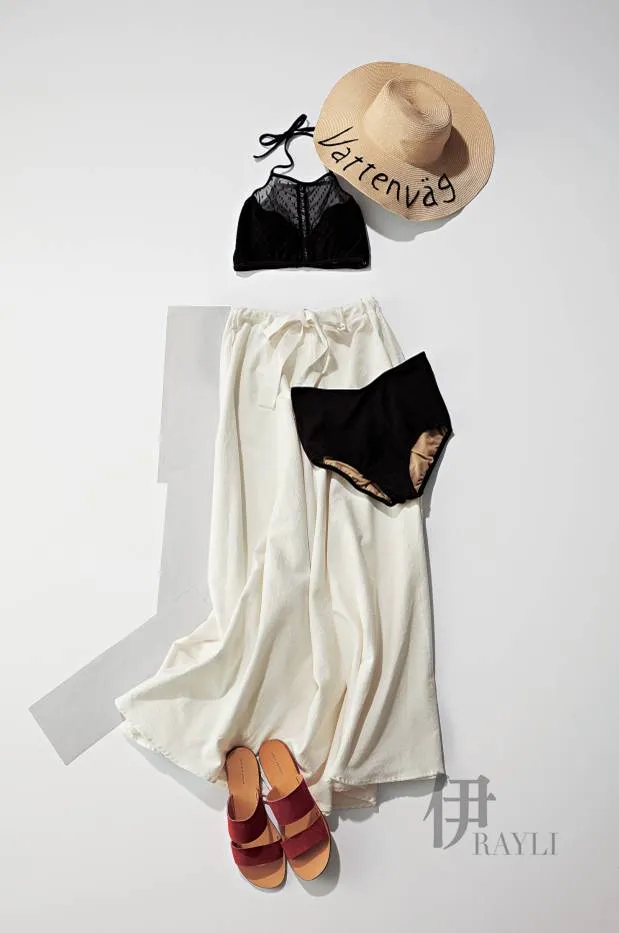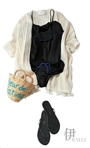 黑色挂脖款式能很好地修饰颈部曲线,搭配白色系带式泳裤视觉对比强烈。比基尼上衣 约720元、比基尼下装 约600元 均为ALEXIASTAM蕾丝罩衫 约468元 Mila owen贝雷帽 约234元 Green labelre la xi ng 编织手包 约690元 bujibaja 凉拖 约960元MARISA REY 手镯 约840元 PHILIPPE AUDIBERT