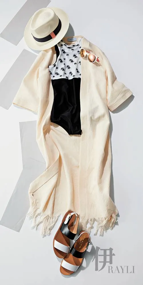 连身泳衣 约900元 Adalu 长袍 约1380元 MAULOA 帽子 约1740元 La cerise sur le chapeau太阳镜 约1800元 PRADA 凉拖 约690元 TABiA
