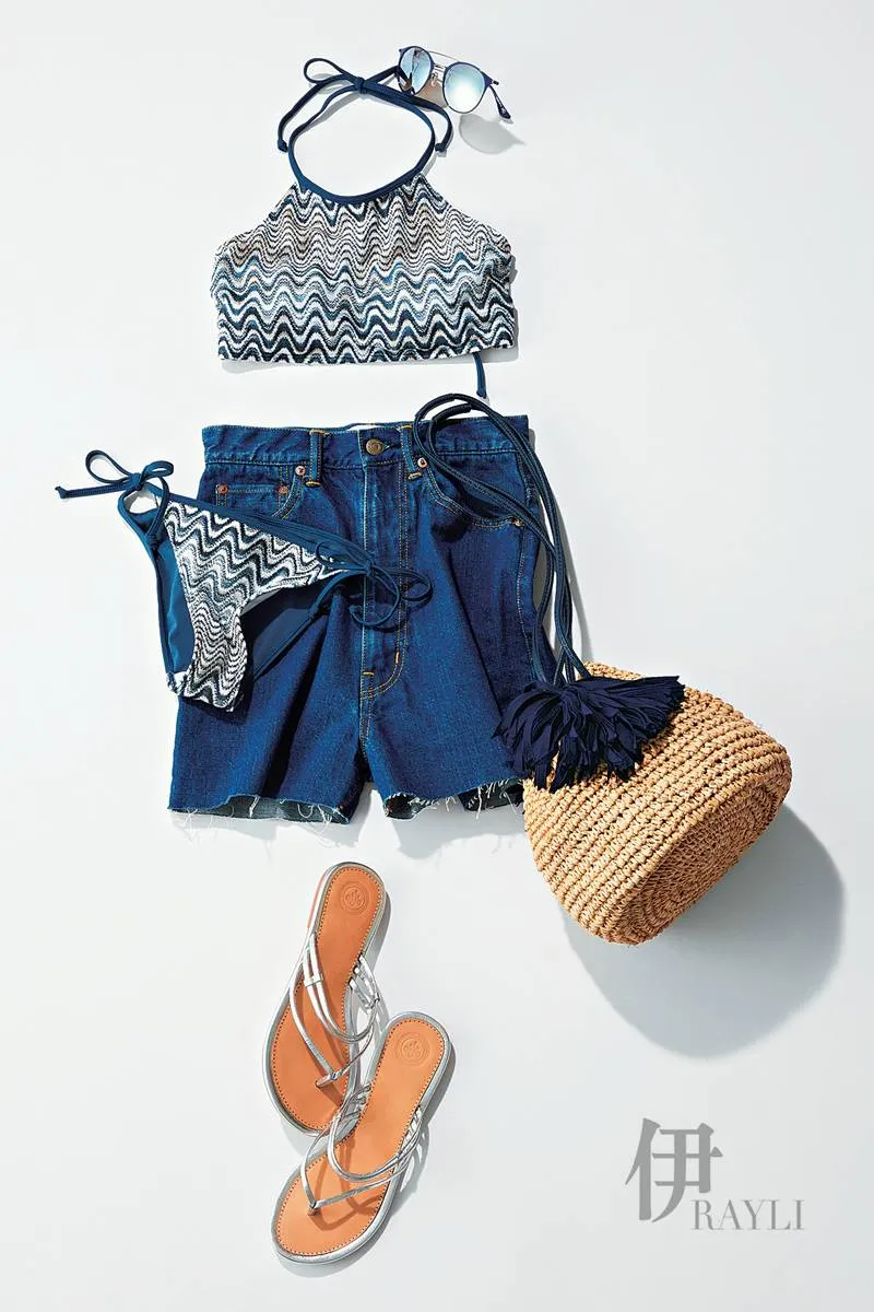 比基尼上衣 约111元、比基尼下装 未定价 均为H&M 牛仔短裤 约948元 Holiday 太阳镜 约1500元 Ray-Ban 抽绳包 约1500元 LUDLOW 凉拖 约720元NOLLEYS&GOODMAN