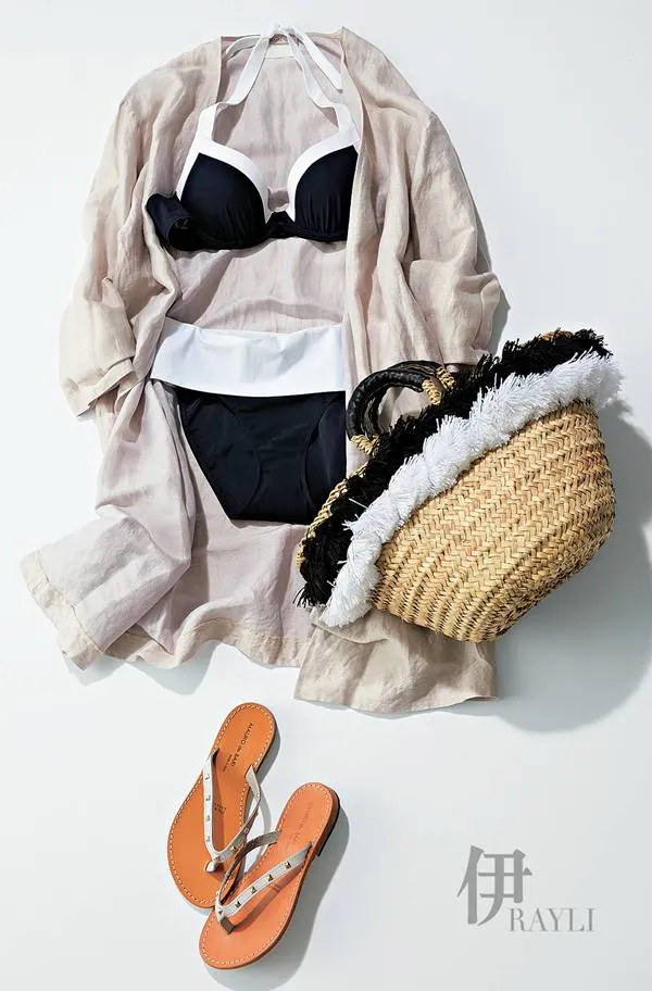 这是一款解决胸部小、外扩烦恼的自然聚拢款式。浅颜色的时髦泳衣搭配白色长袍和编织筐包营造出干练清爽的造型。