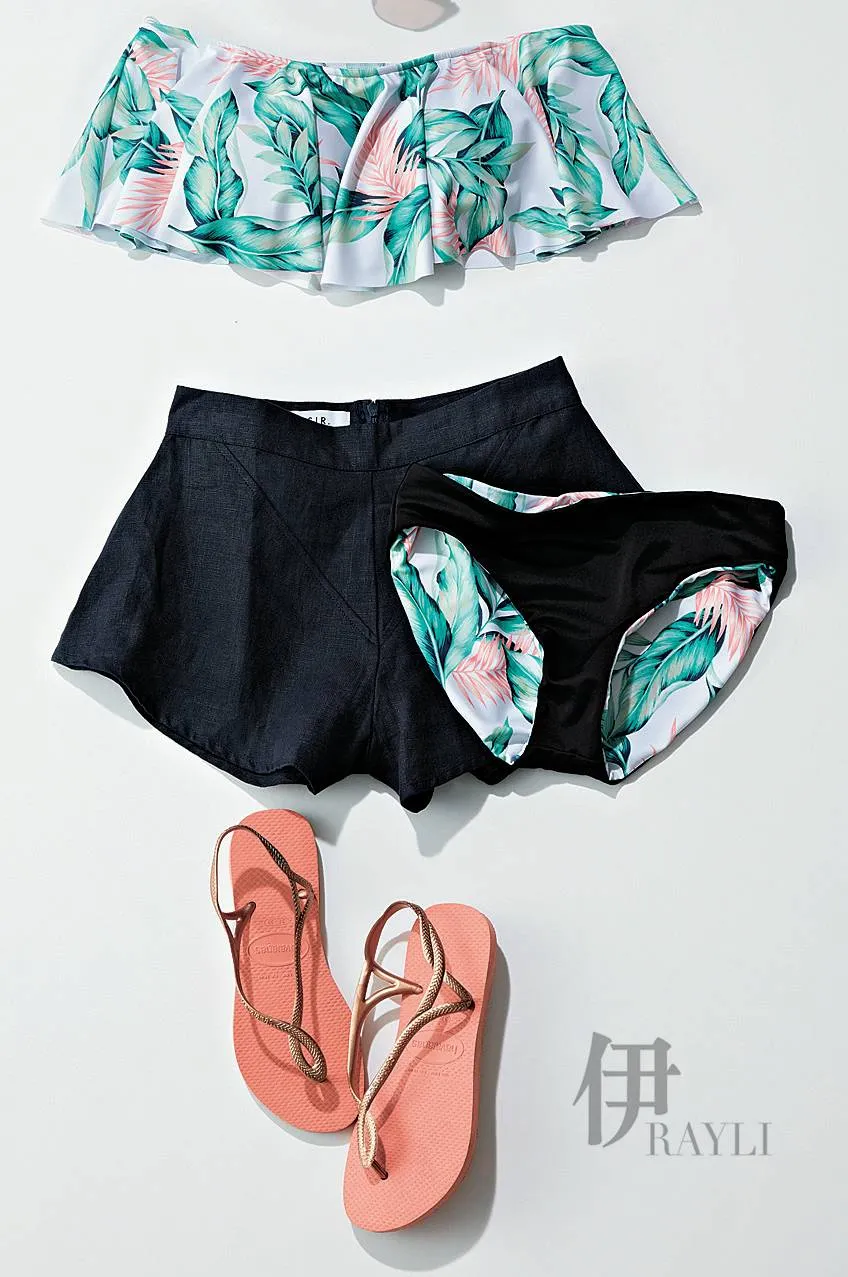 比基尼 约552元 Mila owen 短裤约1260元 Ronherman 太阳镜约2340元 PRADA 凉拖 约180元Havaianas