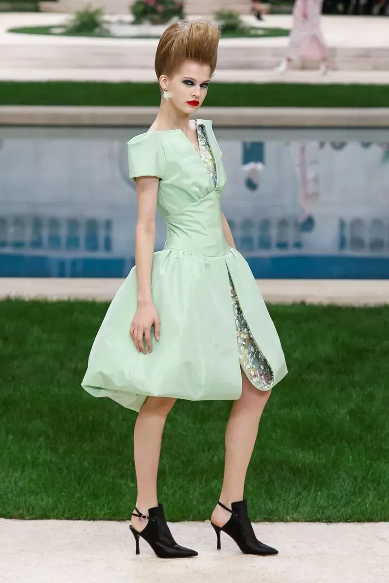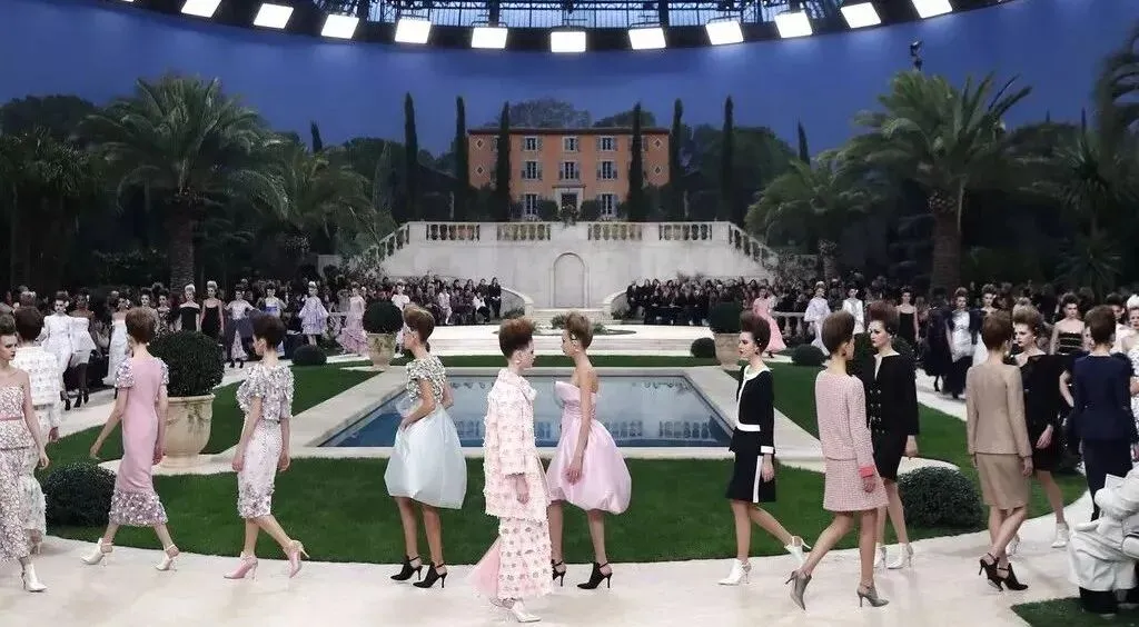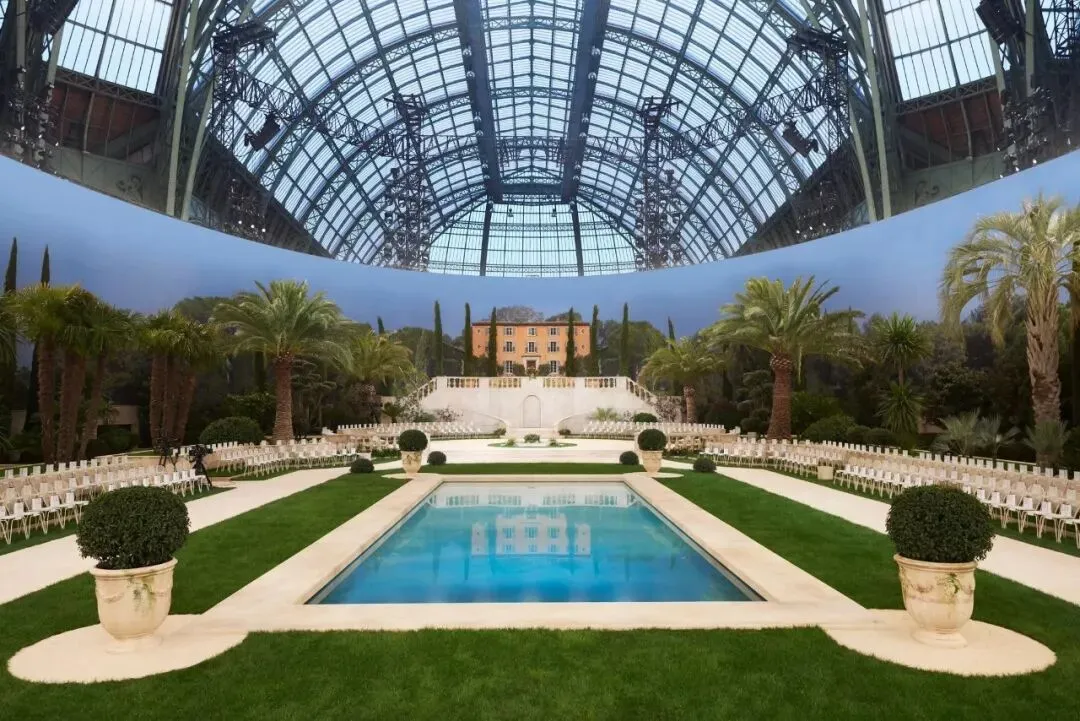 卡尔·拉格斐将巴黎大皇宫化为一座地中海花园。秀场中央一池碧水,周围树木与南方植物环绕而立,线条整齐和谐。园径布局令人想起十八世纪的法式花园。