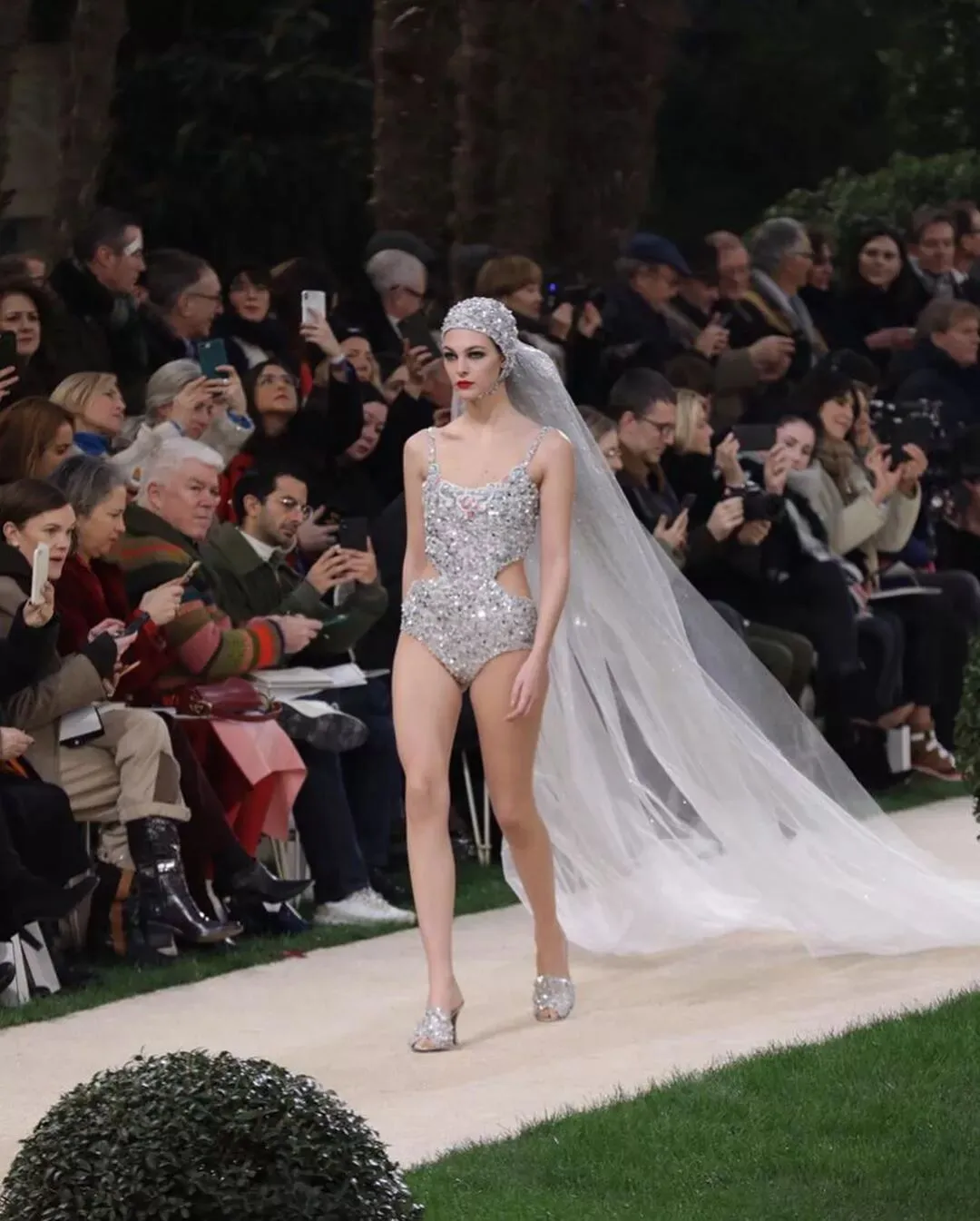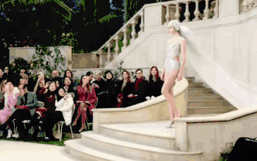 整场秀谢幕大概是本季香奈儿大秀最爆点,满身钻泳装的模特走入,在十八世纪法式宫廷背景的衬托下,华丽感溢出画面。