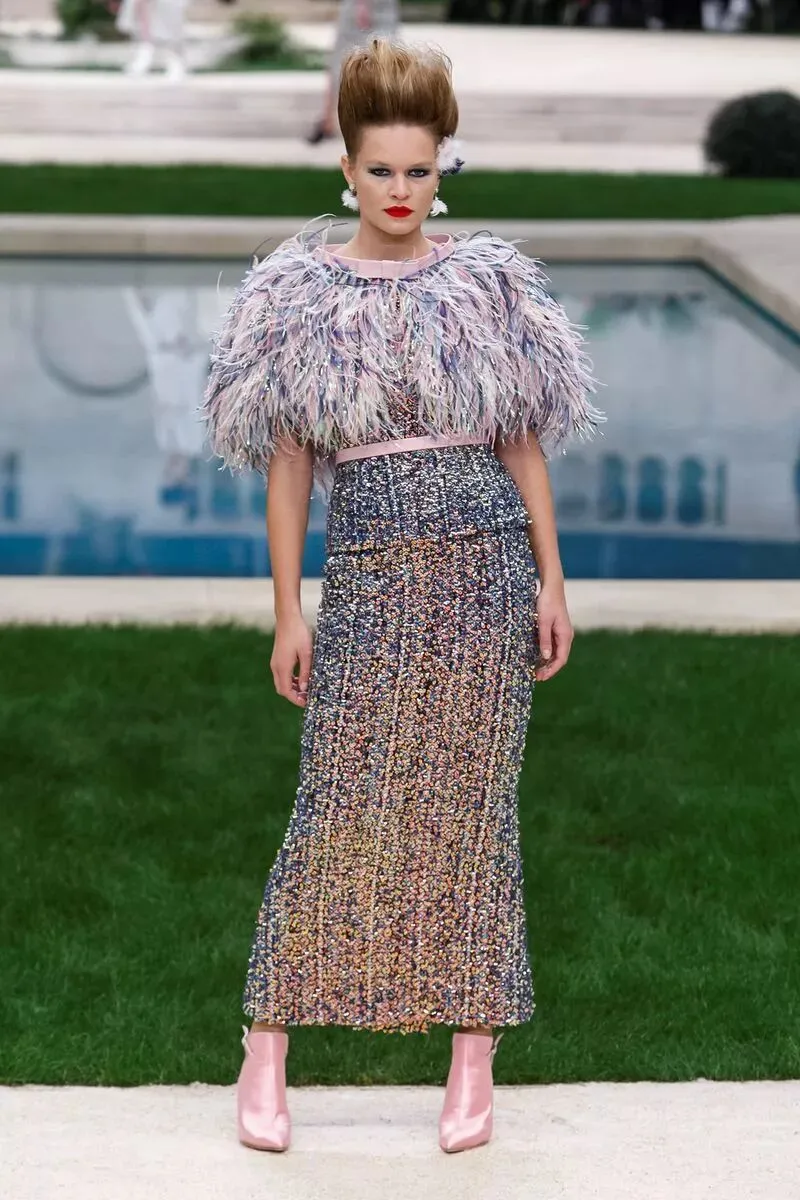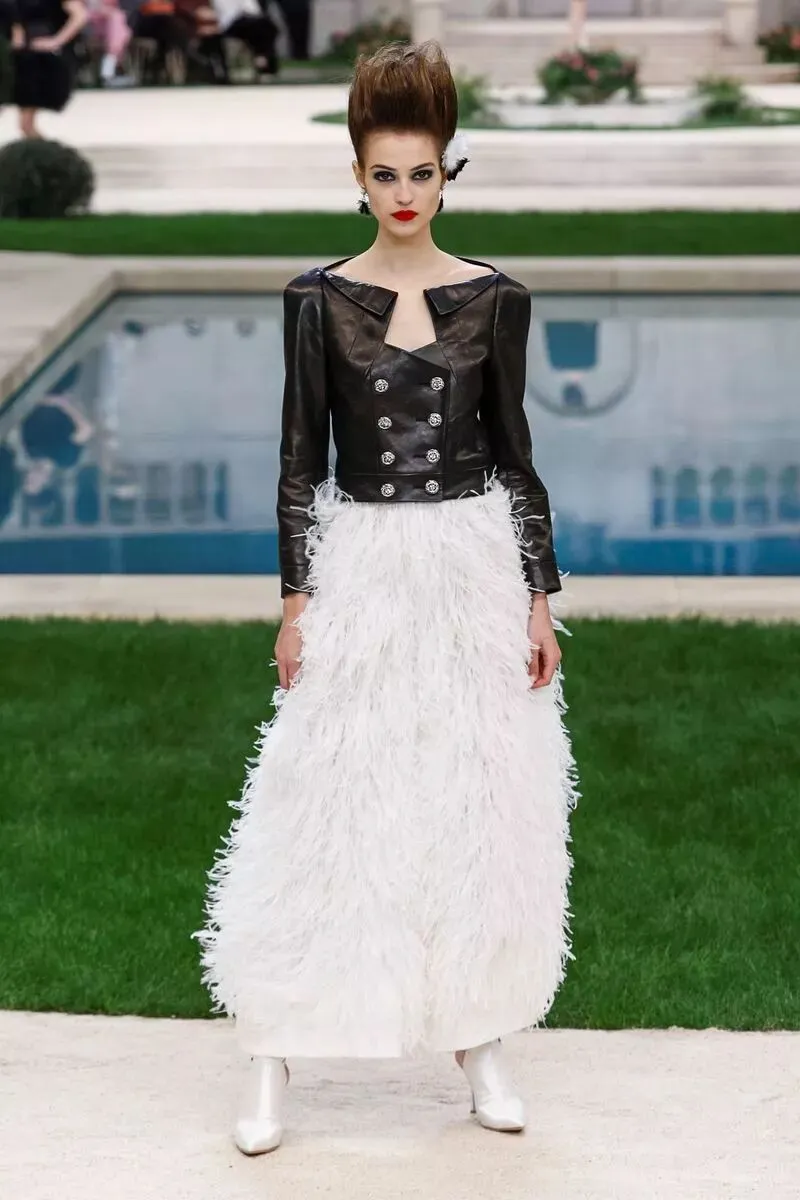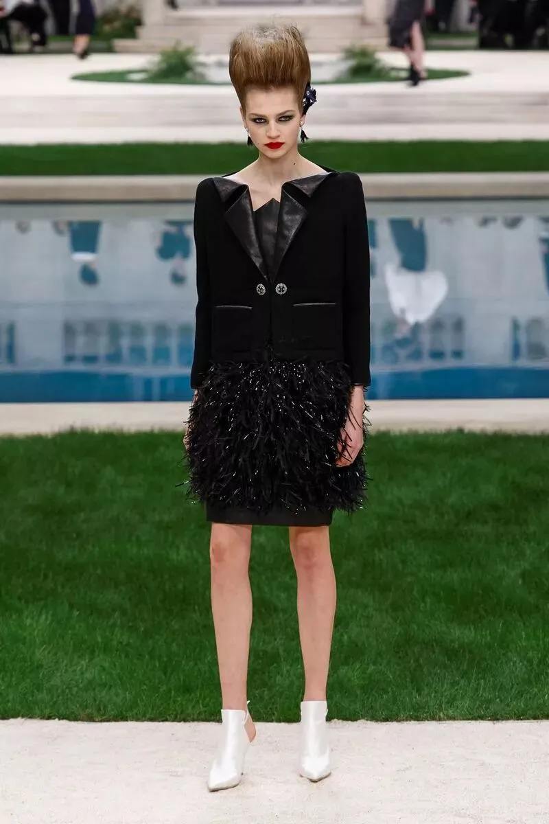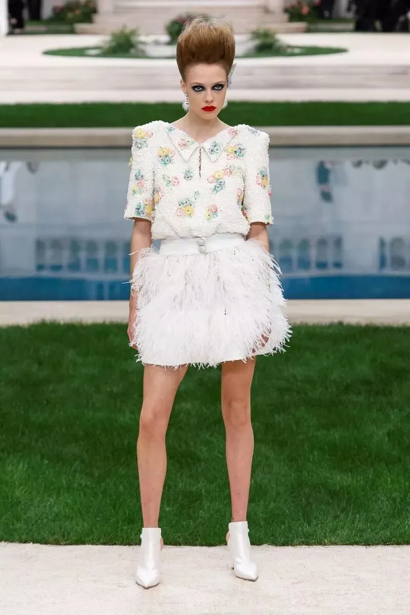 香奈儿 CHANEL 2019 春夏高级定制服的礼服裙选用羽毛质感,如含苞待放的花卉们在花园中争相开放。高腰线设计,或以腰带束出小裙摆,或下摆裁成斯宾塞短外套(spencer jacket),或为做旧皮革外套,部分缀以华美羽饰。