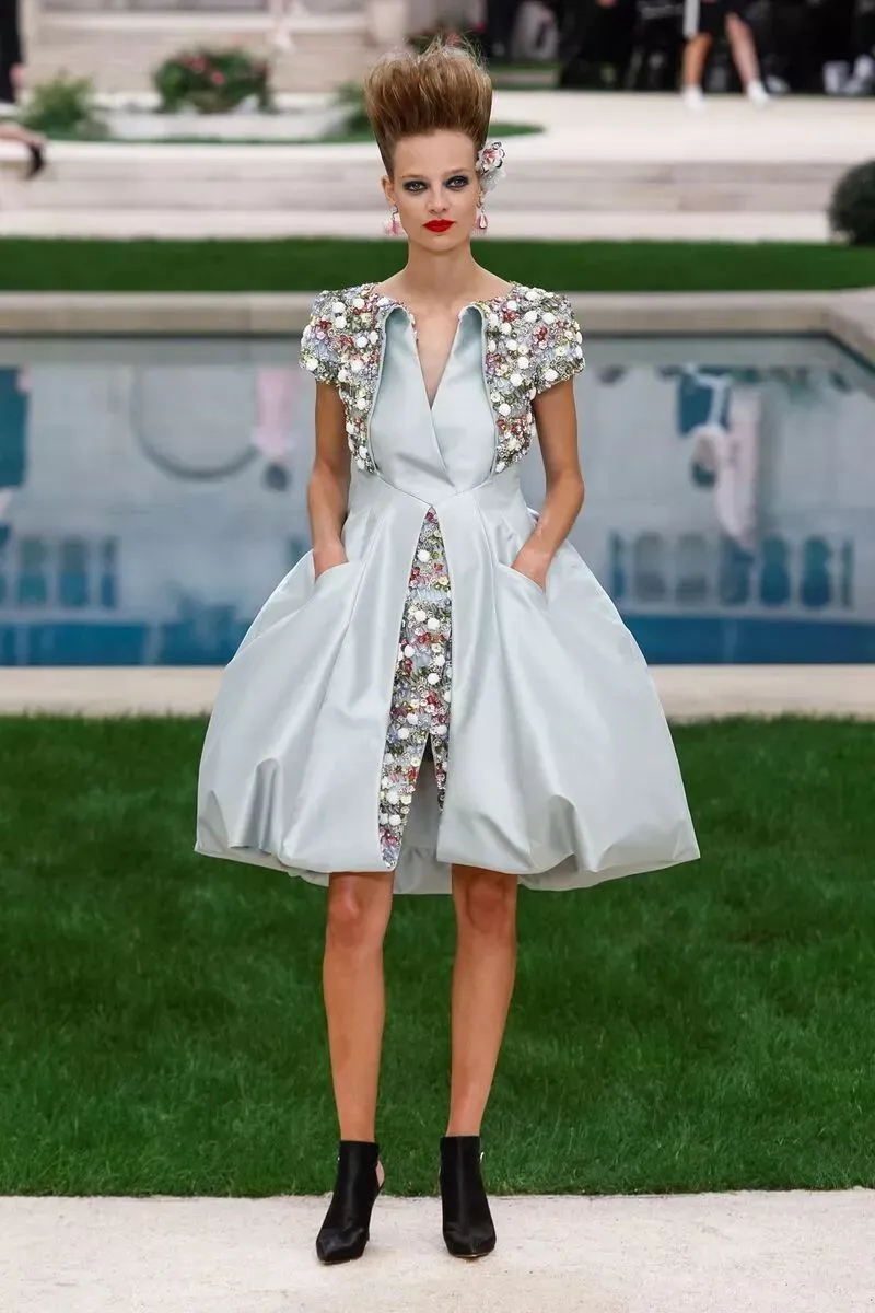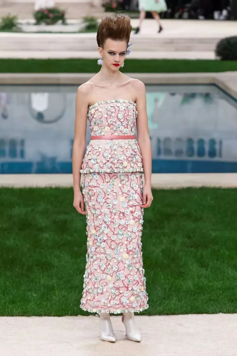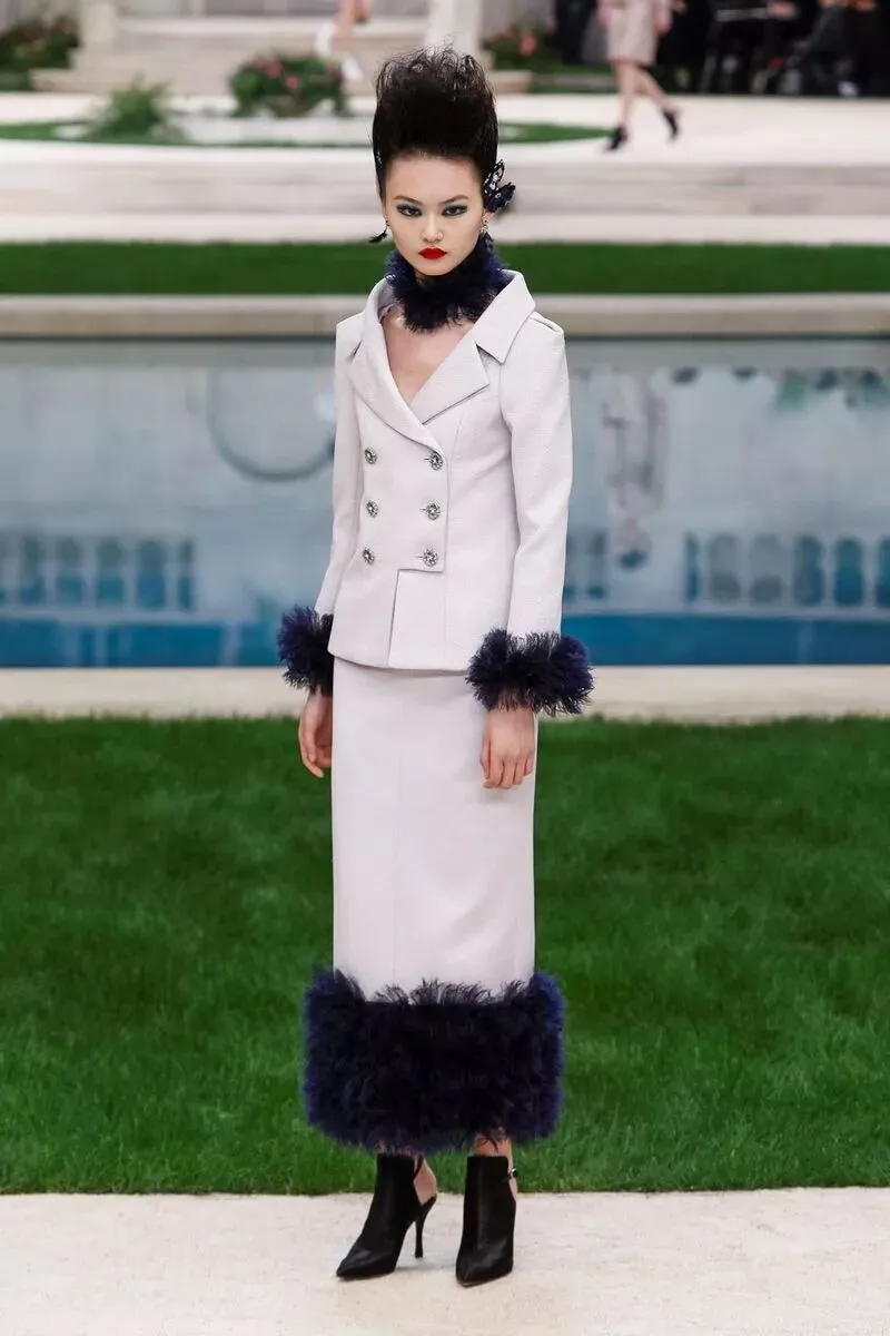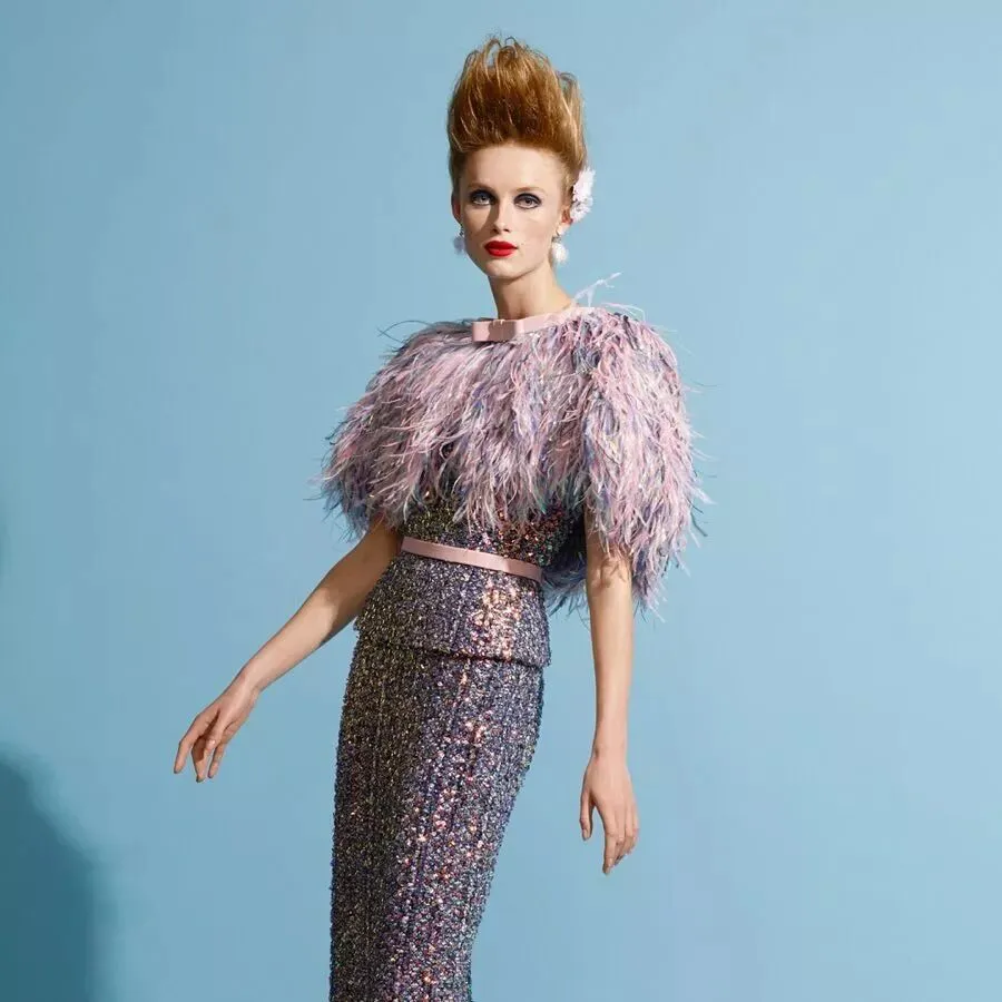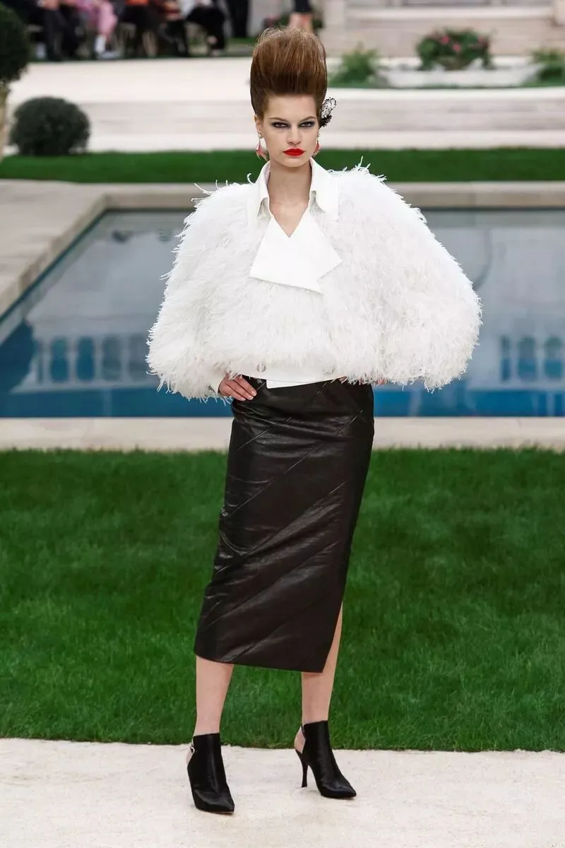 香奈儿 CHANEL 2019 春夏高级定制服的礼服裙选用羽毛质感,如含苞待放的花卉们在花园中争相开放。高腰线设计,或以腰带束出小裙摆,或下摆裁成斯宾塞短外套(spencer jacket),或为做旧皮革外套,部分缀以华美羽饰。
