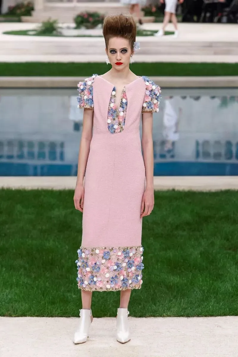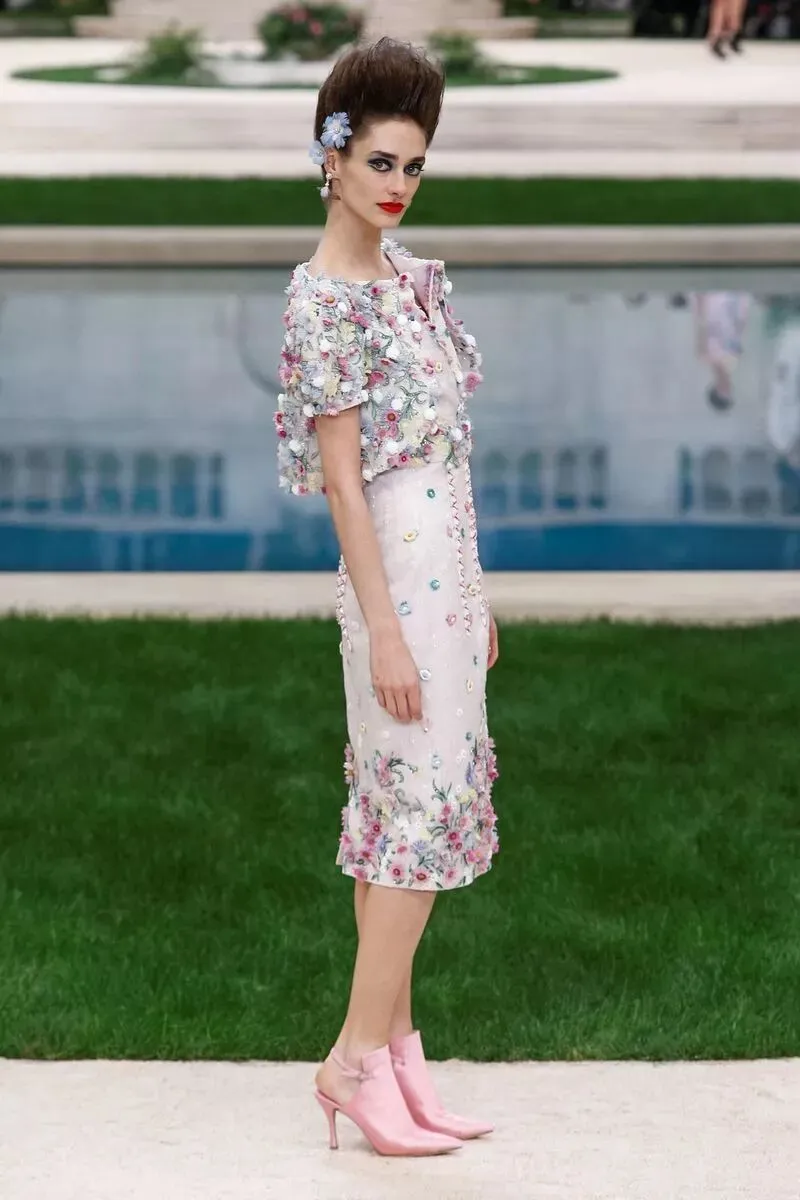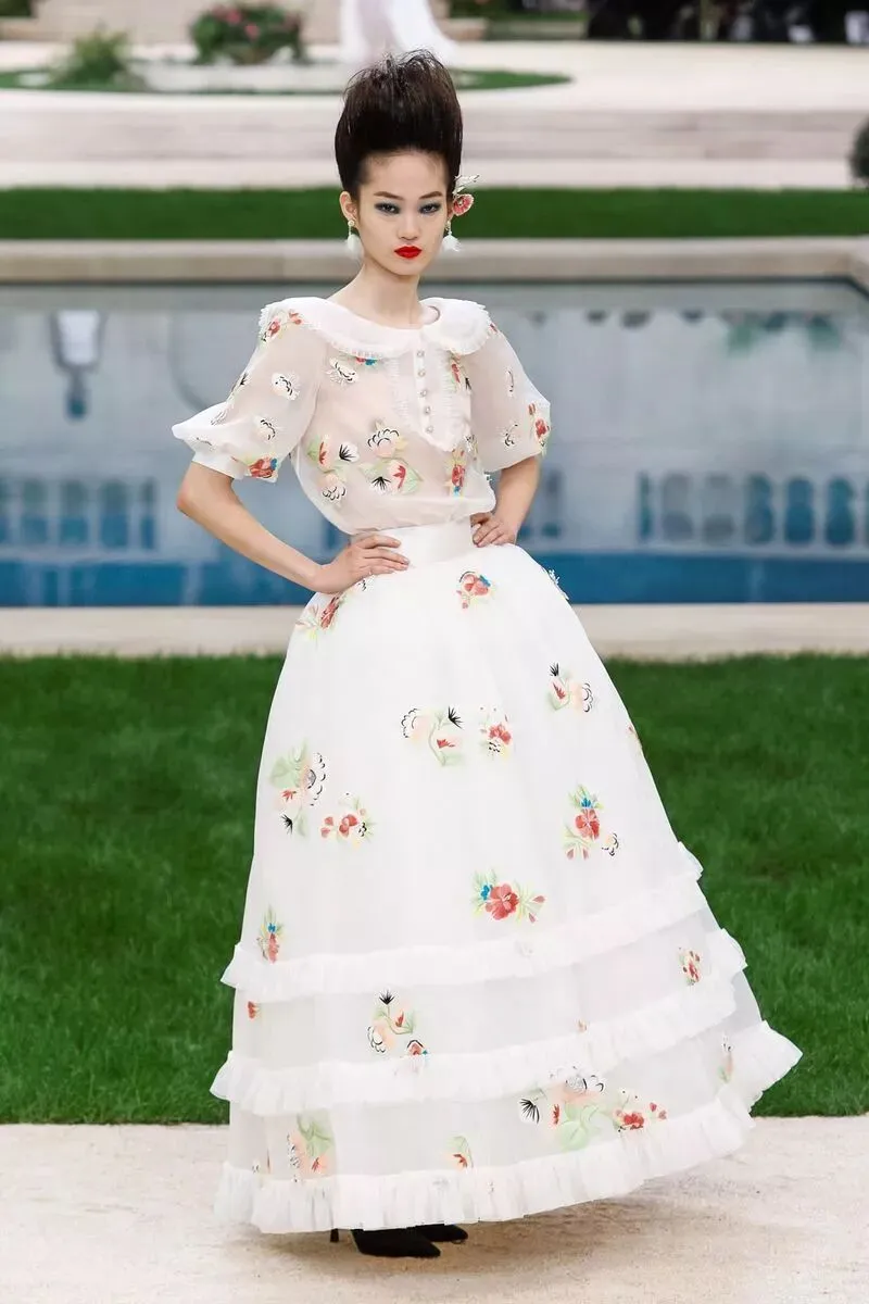 在十八世纪的艺术主题中,花卉扮演着重要的角色,也成为本季高级定制服系列的核心,通过刺绣、手绘、蕾丝、羽毛、名贵树脂甚至陶瓷等形式与材质呈现出来,色调为一簇簇淡彩粉红、草原绿和天空蓝,结合优雅的黑、白、米、海军蓝和幻彩金银色。