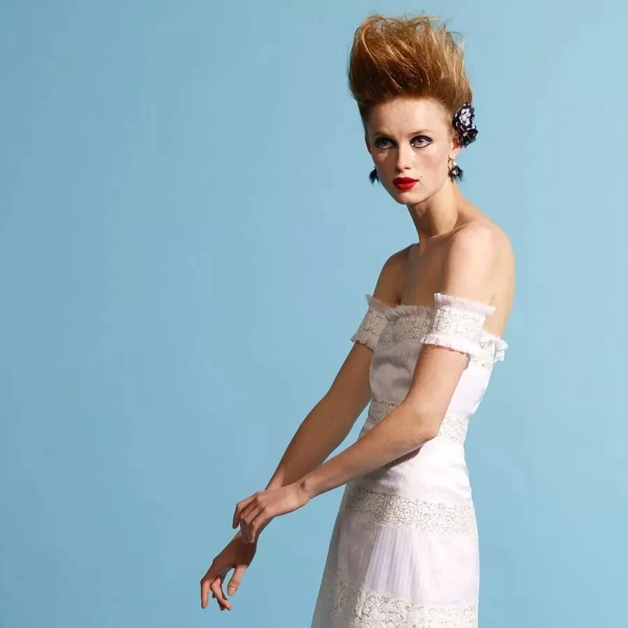 曼妙纤长配合高耸的发型,船型领口,肩部采用凹折式结构,略呈圆润尖角,充满图形艺术之美,整体轮廓贴合身体线条,长至小腿。