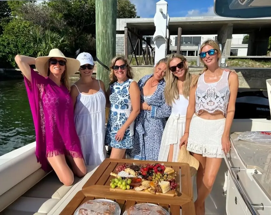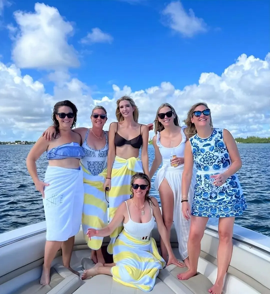伊万卡以及她的闺蜜团,还化身成了“乘风破浪的姐姐”(只不过是风平浪静),站在小游艇上来了一张令人印象深刻的合影。