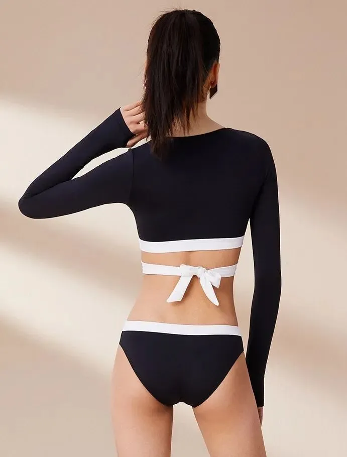 不过我最喜欢的还是这件连体泳衣,深V的领口设计搭配简单的黑白色拼接,腰部拉出一条白色的线,提升腰线的存在感。