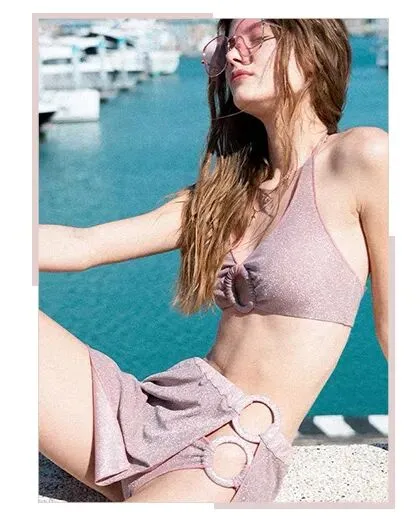 前段时间出了款blingbling(亮闪闪)材质的分体式泳衣,比基尼套装外贴心的加上了小裙子,遮羞高手,还有小开衩设计,就是让我们不经意间的骚断腿啊!