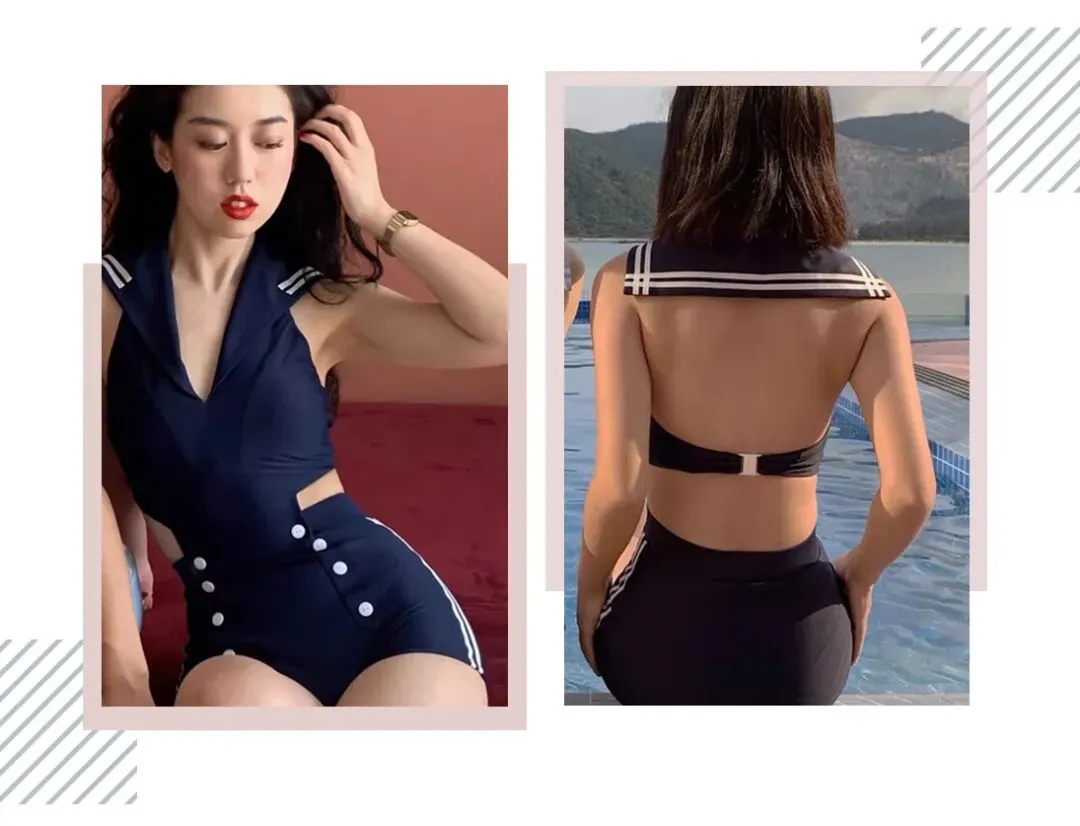 以及美式复古海军风泳衣,色彩靓丽但不至于跳脱,穿上后复古范满满,还衬得人青春有活力,瞬间就有美剧中高中学生那股青春活泼的劲儿了。