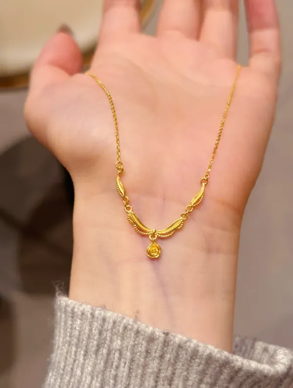说到细节,这条项链真的很懂女生心思。它用的是AU999足金,含金量99.9%,金色很细腻很温柔,带点微微奶油调,不会显老气。整条项链做得很小巧,链条细细的,长度是42cm,戴在锁骨上刚刚好,不会太短也不会太松。最特别的是中间有做法式蕾丝花边的造型,两侧是微微弯曲的叶片,中间还挂着一颗立体小玫瑰,真的每个细节都好精致,单独看就是那种很有法式氛围感的小美好。重量的话我特地称了一下,差不多2.1g,价格是595元/克,算下来1200多,真的不会有黄金饰品的那种“负担感”,反而是日常随心戴的轻盈款。