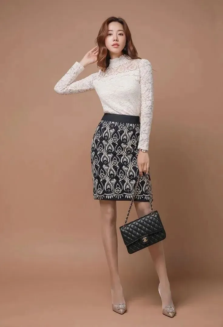 最近看到一套穿搭,真是让人眼前一亮。白色蕾丝上衣配黑色花纹包臀裙,脚上一双浅金色高跟鞋,手里拎着黑色菱格链条包。就是这么简单的几件单品,组合在一起却特别有味道。