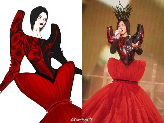 太绝了,因为这些衣服光看画稿确实是美的,可是实际上做出来是很浮夸的,但张韶涵就是能撑住这些Drama、惊悚、有趣的设计。