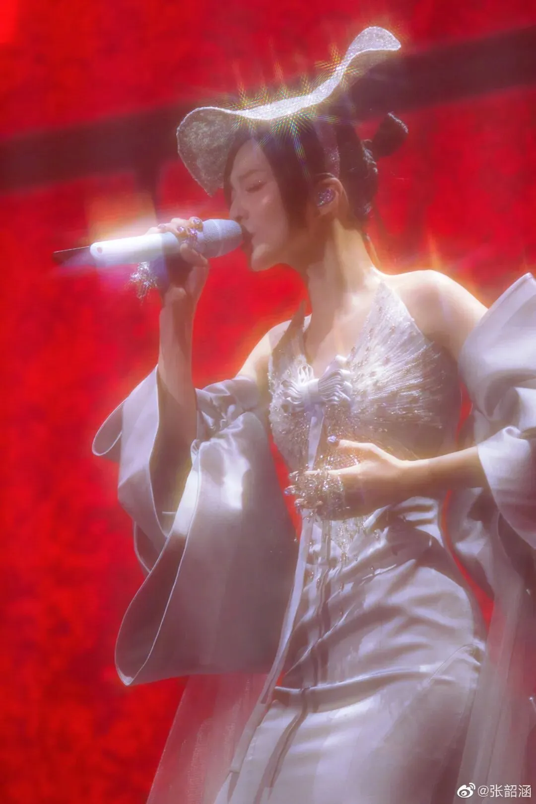 这套礼服没有用过多的鲜花去点缀,而是用薄纱把张韶涵包裹成了一朵盛开的鲜花,太有生命力的美。
