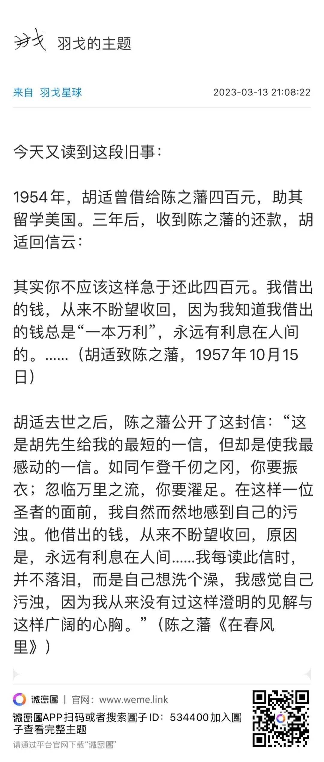 与友人谈及助人,我信奉并努力恪行胡适先生的一本万利之说。自少及长,屡得师友助益,无论精神还是物质,一一铭记在心。后来略有余力,自当推己及人,遇到求助者、落难者等,尽力施以援手,拉一把是一把,帮一分是一分。正如当年帮助我的人,从不求我的回报,我对于帮助过的人,态度也是如此。与其讲求回报,不如把这份心力,用于帮助他人。如此滚雪球般,终致一利而生万利,一人而助万人。(2023年4月6日)