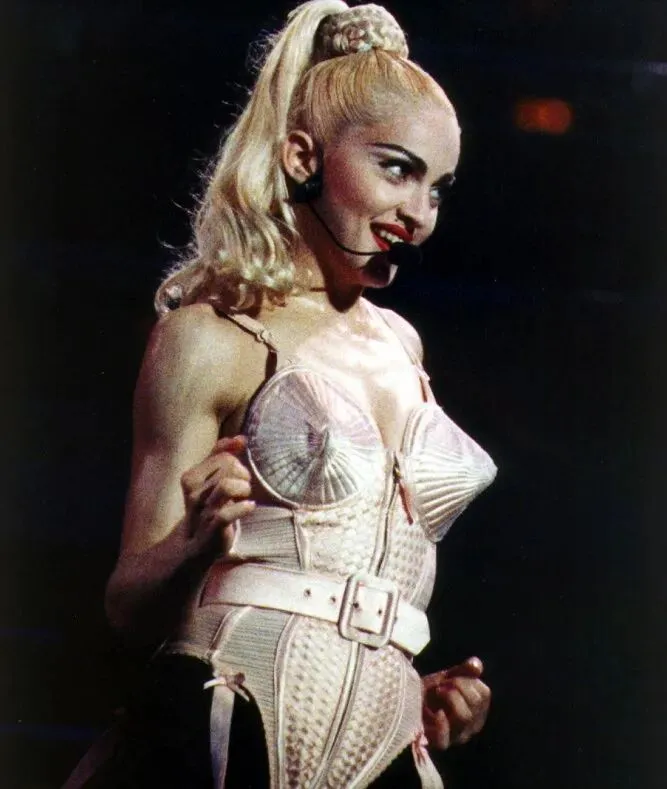 说到胸衣外穿,大多数人会想到1990年麦当娜“金发雄心世界巡回演唱会”上的造型。