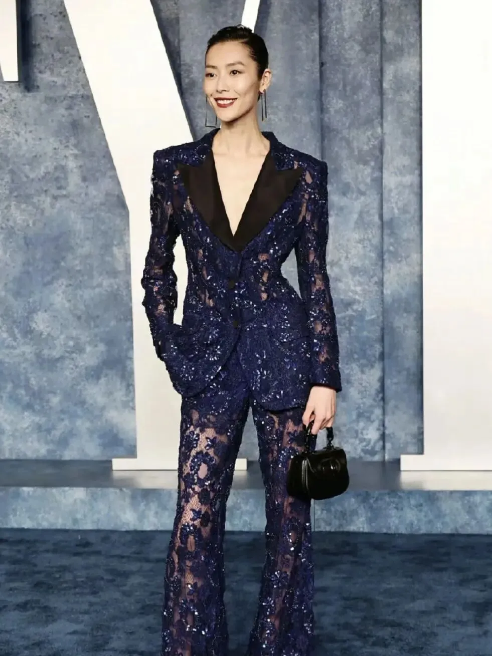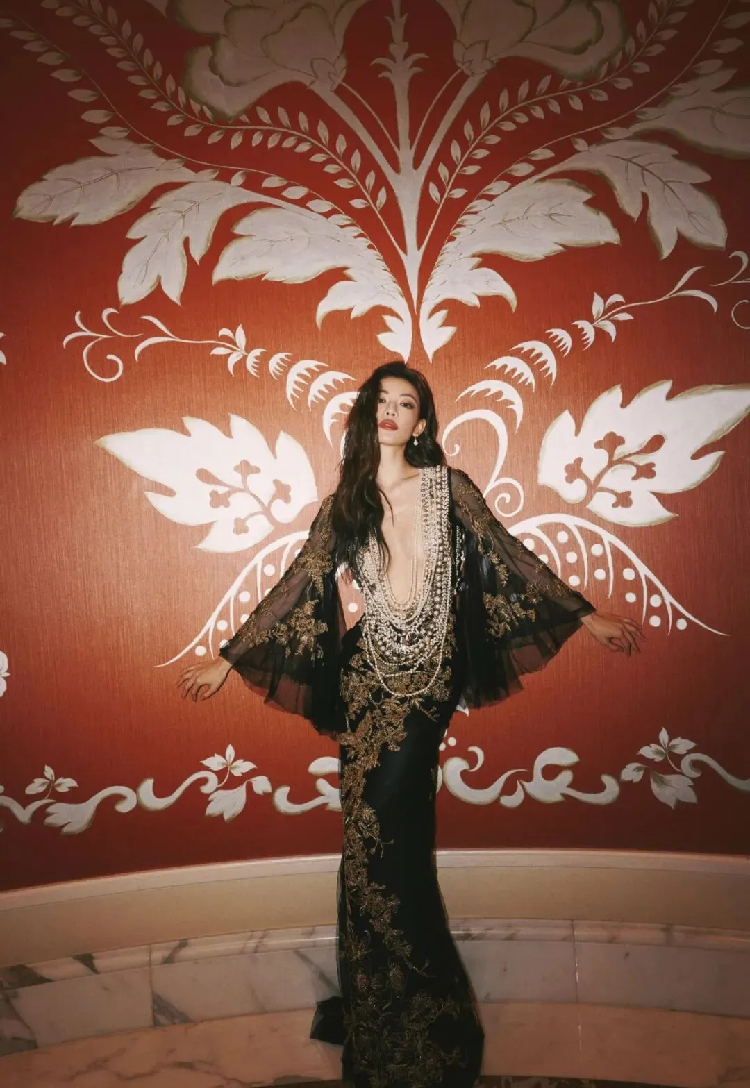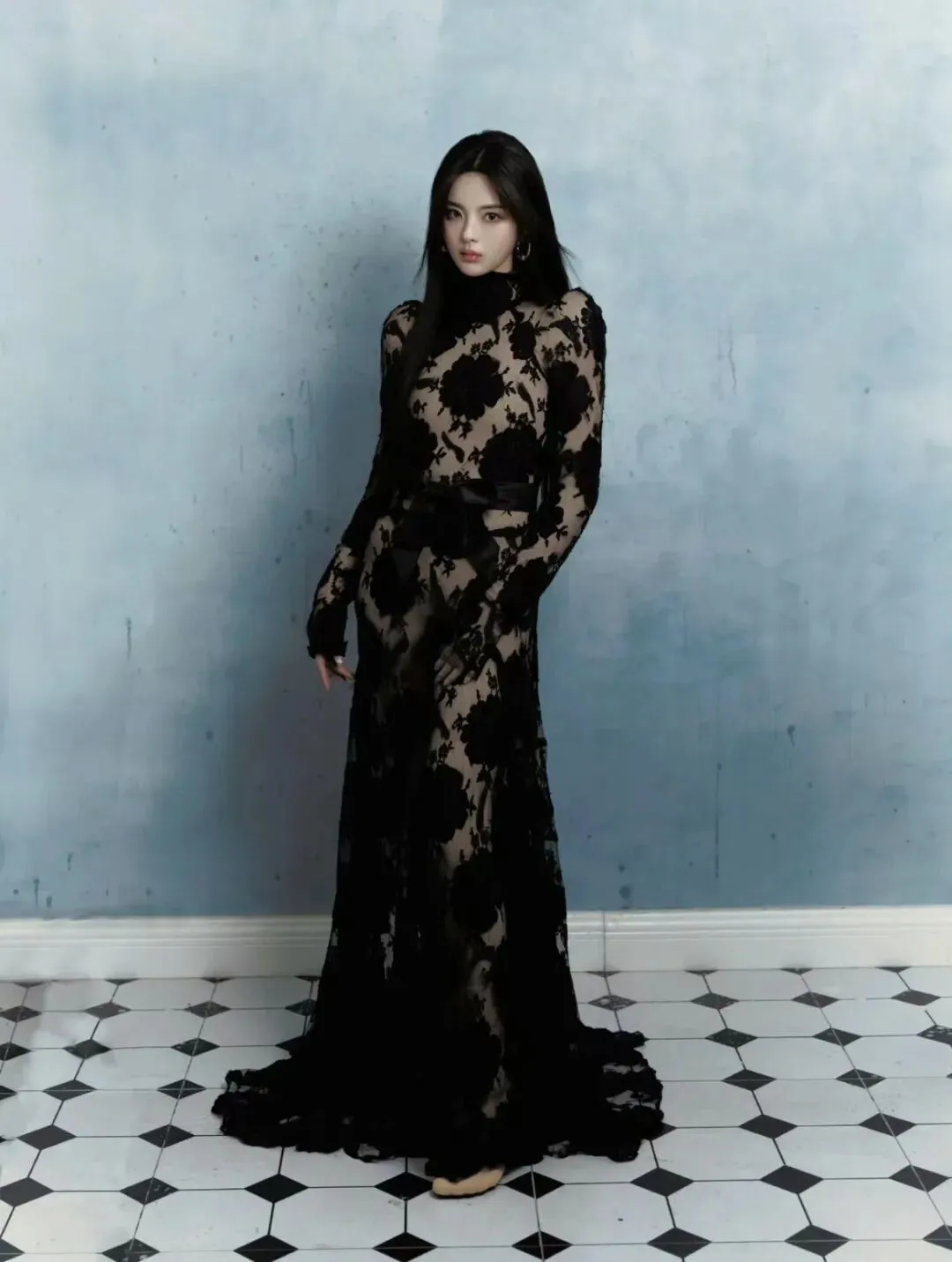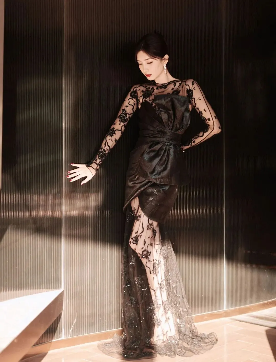 江疏影优越的美腿一直以来都是她的标志之一,这一身黑色蕾丝花朵刺绣薄纱黑裙将她的优点发挥到了极致。薄纱裙的透视效果,使她的腿部线条时隐时显,给人一种朦胧的美感。克制的黑色此刻更添风情,勾勒出迷人的曲线美。于光影摇曳之中熠熠生辉。