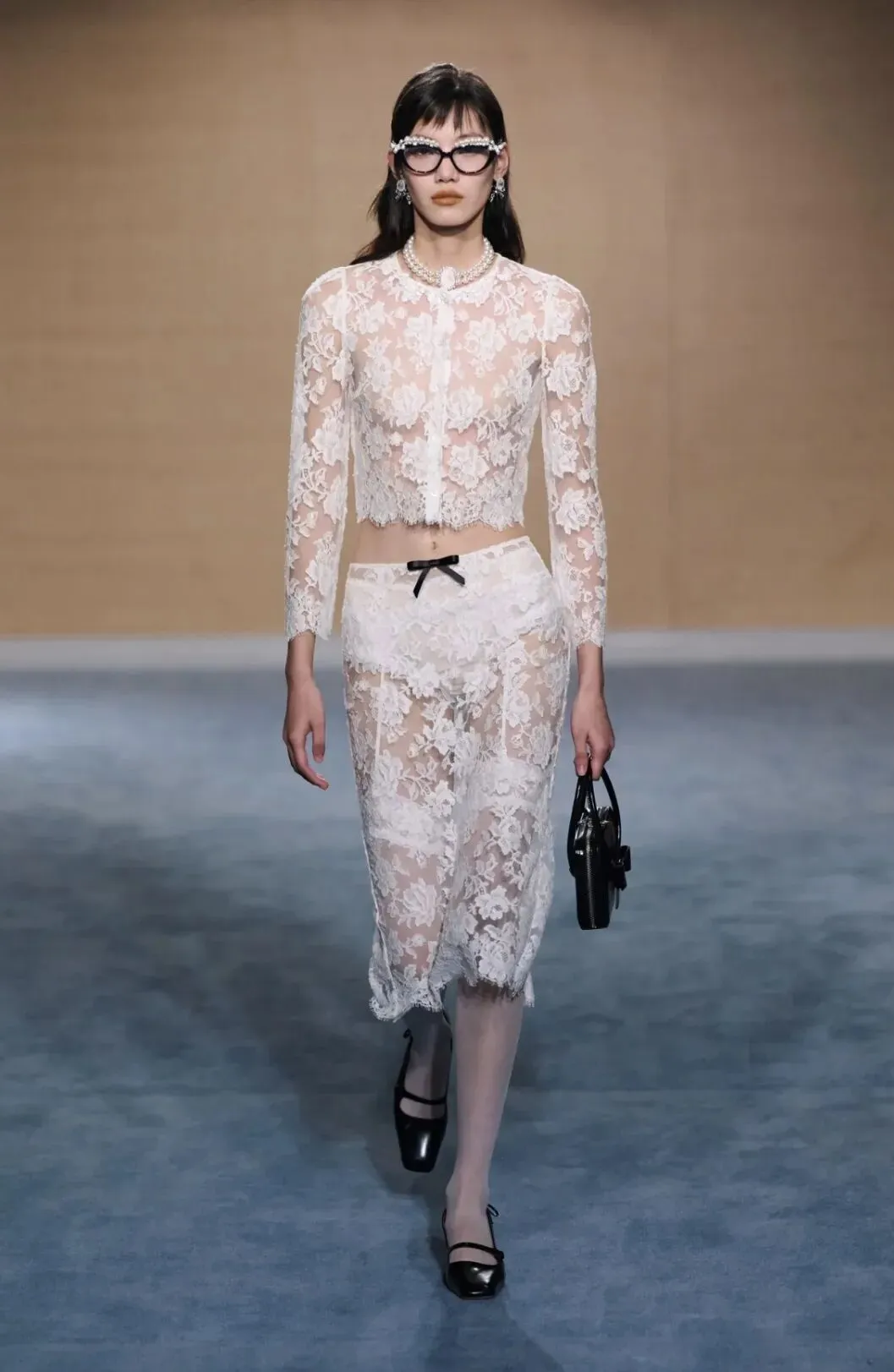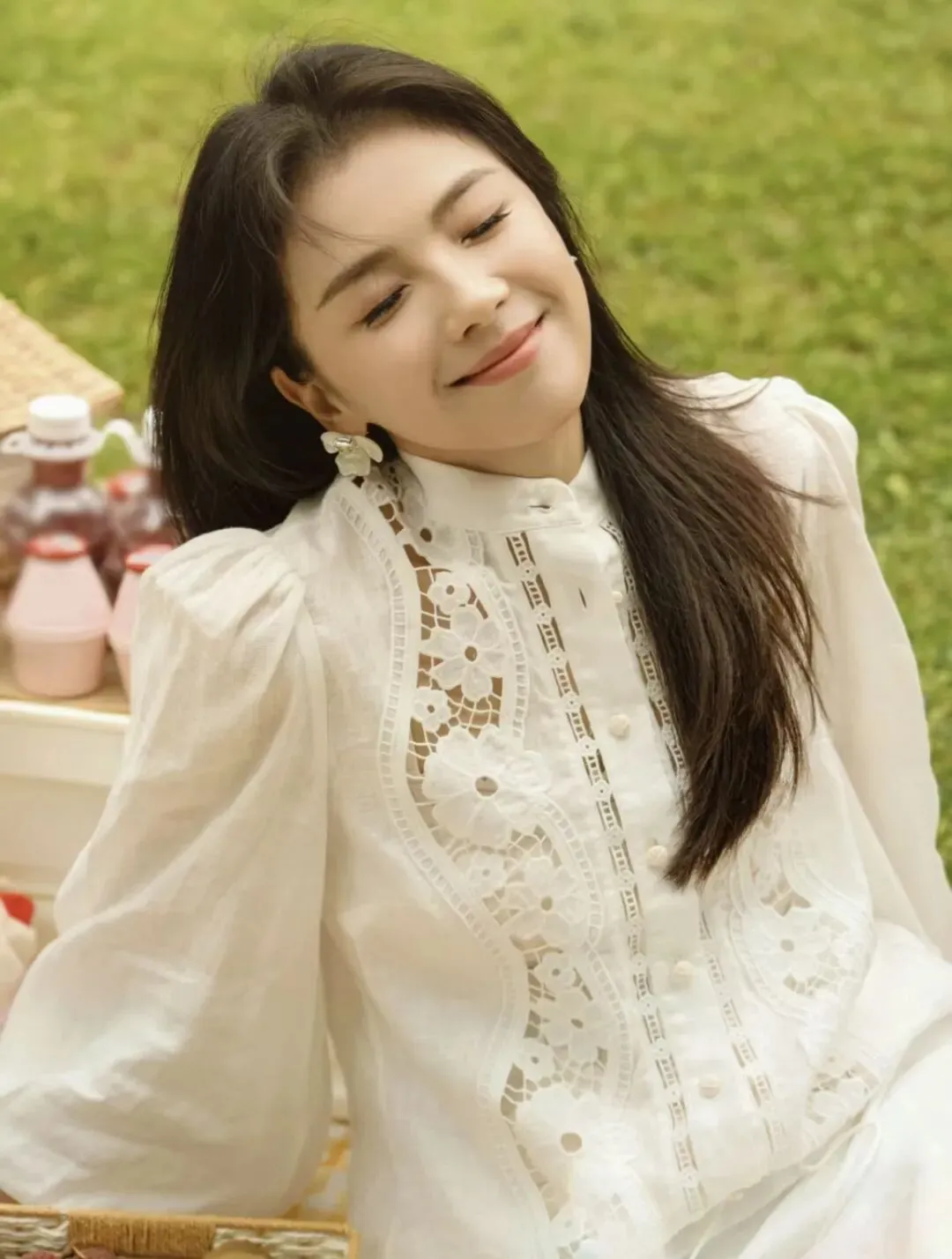 蕾丝罩衫以解构的形式带来层次感,消除大面积带来的厚重感。在原本蕾丝基础上增添装饰与花边,透视性显得仙气十足,绝美一览无余。