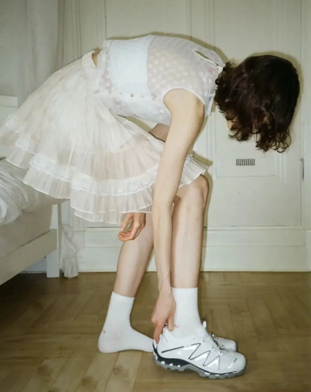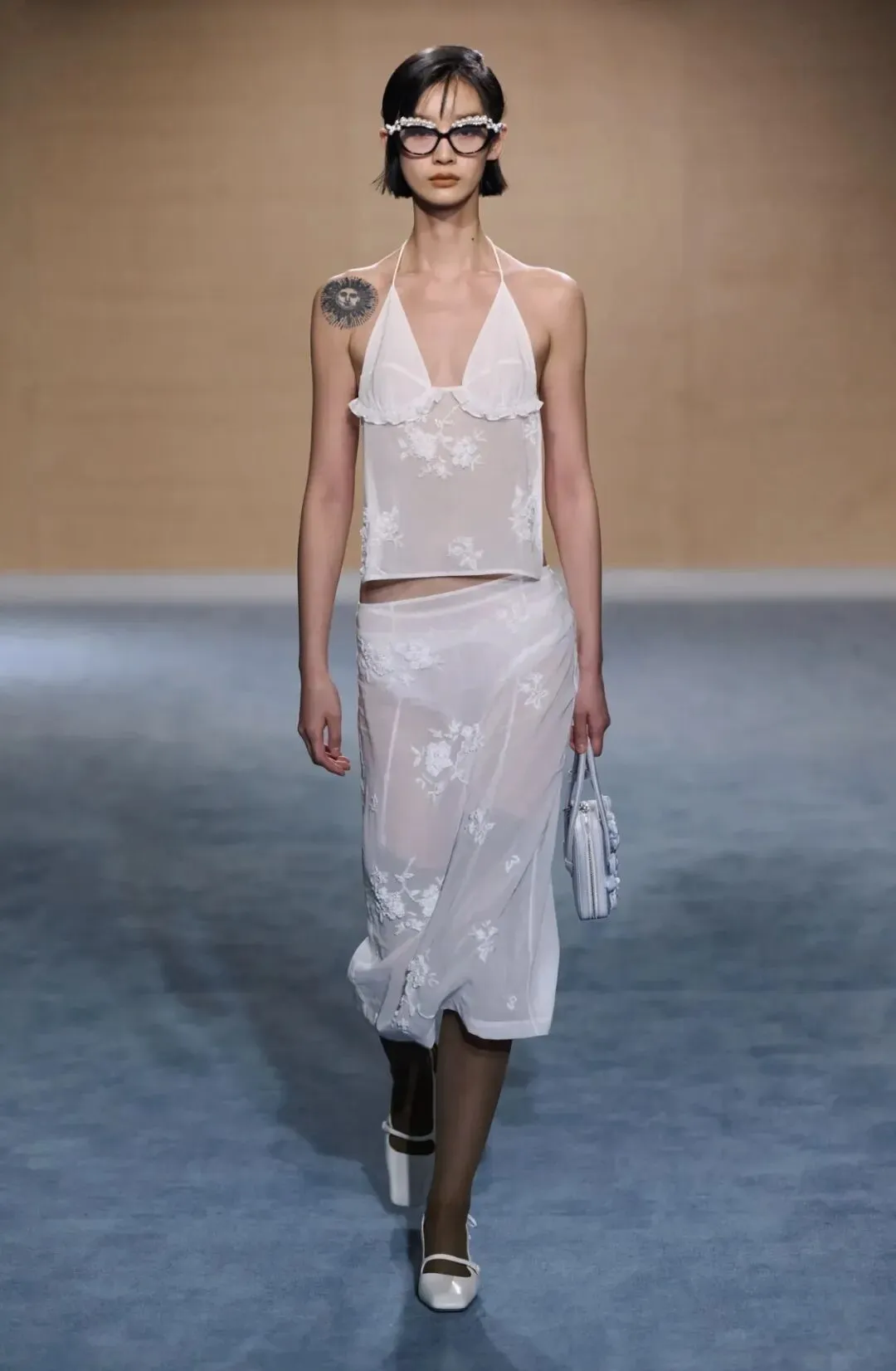 SHUSHU/TONG 2024春夏系列以摄影师Helmut Newton的作品《Big Nude》为灵感,以更丰富的设计语言去构建女性叙事,它流转于肃穆之间,又肆无忌惮地展露性感的力量。手绣蕾丝作为系列主元素连至腰间或裹于腿部,隐约透出若即若离的肌肤质感,诉诸出性感与张力。无论是模糊不明的暧昧蕾丝元素,又或是古典庄重的修长廓形,其透露出的讯号无关情色,而是在探索植根在每个女性身体中的锋芒。
