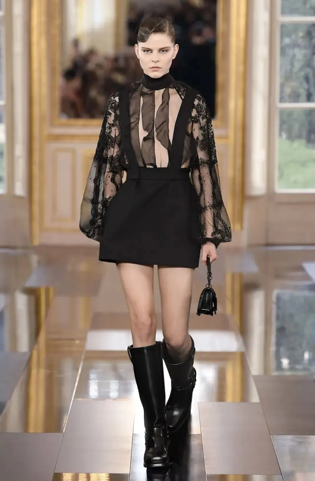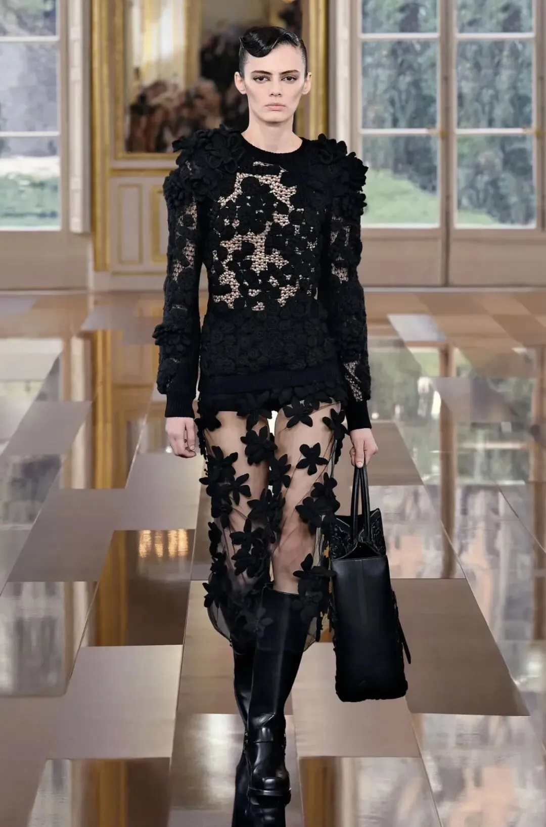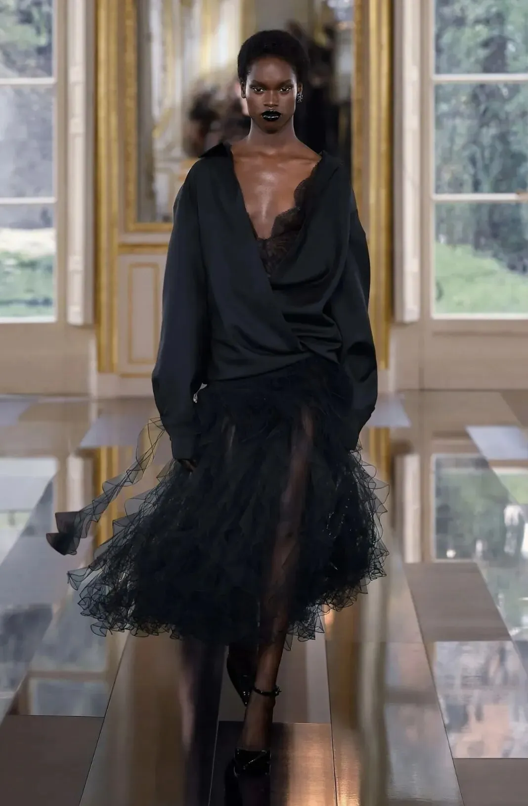 Valentino2024秋冬系列“Le Noir”了打造一场颠覆性的黑色盛宴。通过黑色挑战刻板印象,以全新的视角诠释无尽微妙的色调变幻,以薄纱、刺绣、蕾丝重绎品牌风范。本季采用大量透视和蕾丝元素,以飘逸流动的薄纱轻覆肌肤之上,勾勒曼妙身姿。蕾丝缀于裙身,为造型注入古典元素,同时制造出反差,带来充满层次的浪漫色彩。