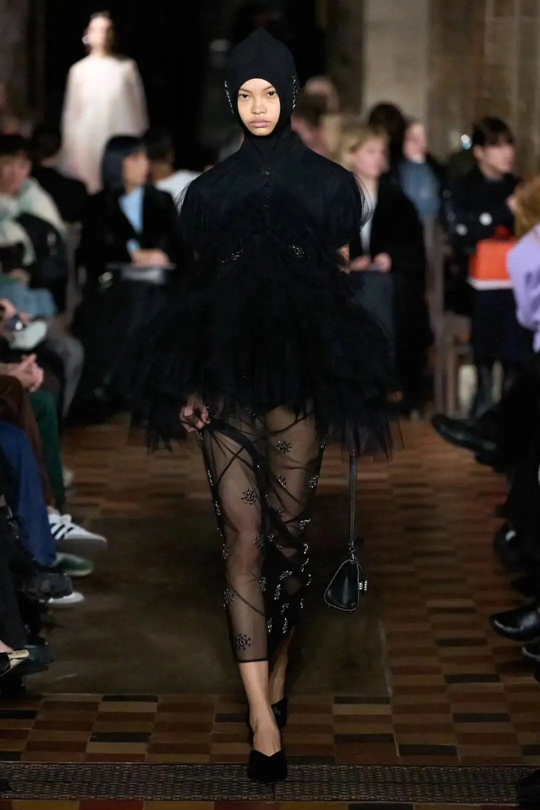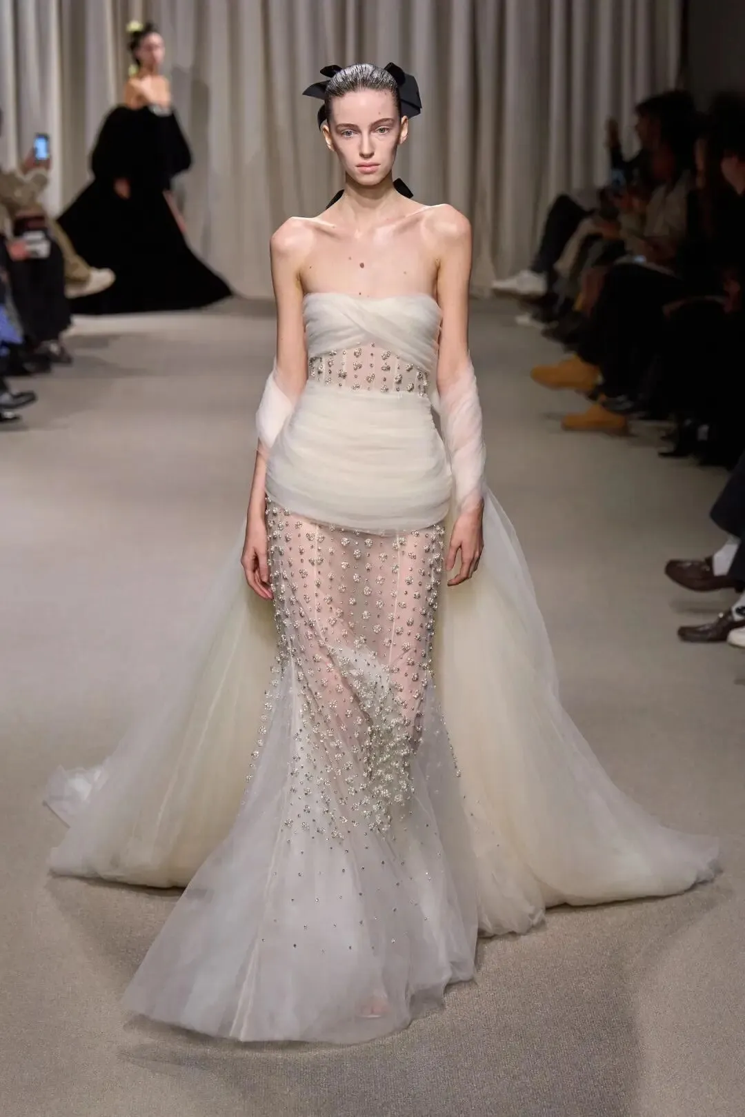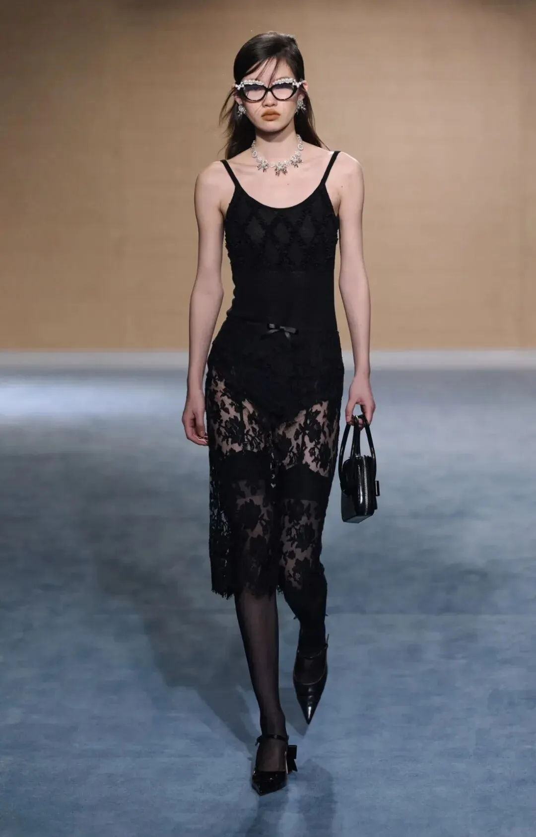 Valentino2024秋冬系列“Le Noir”了打造一场颠覆性的黑色盛宴。通过黑色挑战刻板印象,以全新的视角诠释无尽微妙的色调变幻,以薄纱、刺绣、蕾丝重绎品牌风范。本季采用大量透视和蕾丝元素,以飘逸流动的薄纱轻覆肌肤之上,勾勒曼妙身姿。蕾丝缀于裙身,为造型注入古典元素,同时制造出反差,带来充满层次的浪漫色彩。
