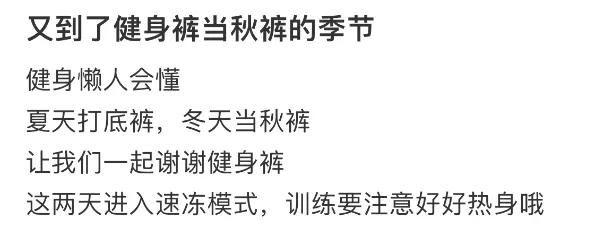 社交平台上,不少人晒出自己瑜伽裤套运动裤的照片,并热情洋溢地对外安利:我宣布瑜伽裤就是秋裤之王!