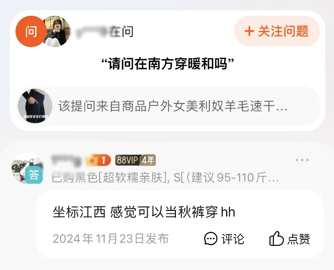 甚至在瑜伽裤商品的评论区「问大家」这一栏,也频频出现「可以当保暖裤穿里面吗」「请问在南方穿暖和吗」等问题,不少消费者直接把瑜伽裤和保暖秋裤划等号。