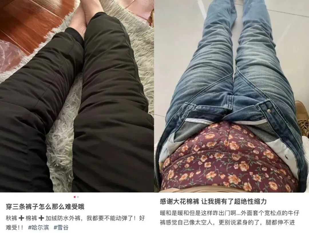 在社交平台上,秋裤 + 加绒牛仔裤的组合被称为「冬日超绝性缩力形态」,有温度但没风度。