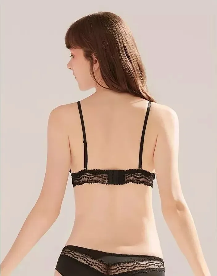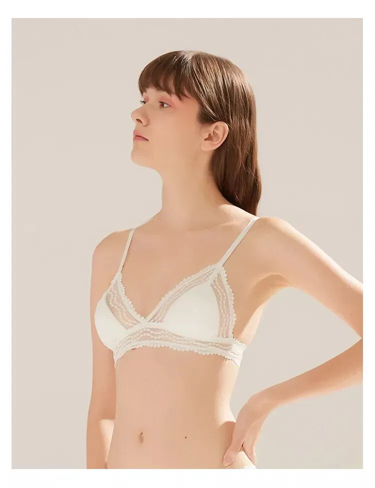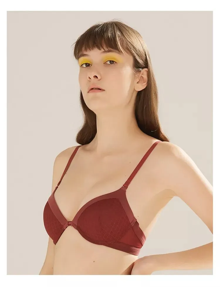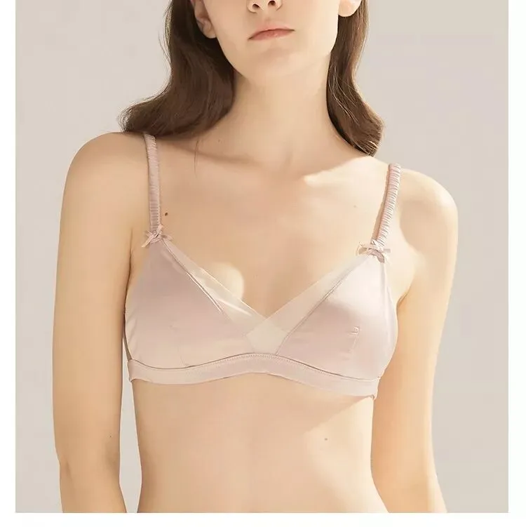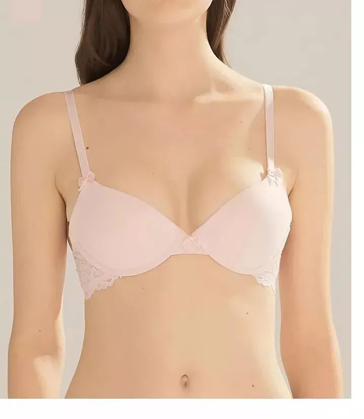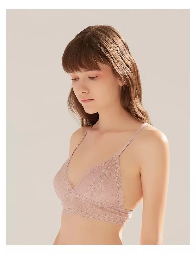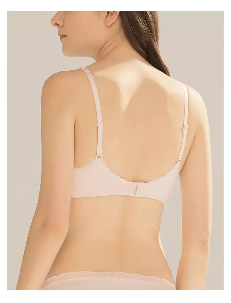 一款是kiki文胸无背扣无钢圈0.4cm薄杯,底围的镂空织带设计,让这款多了一些运动气息。想入有春日气息的豆粉色,在冬天里期待春天。