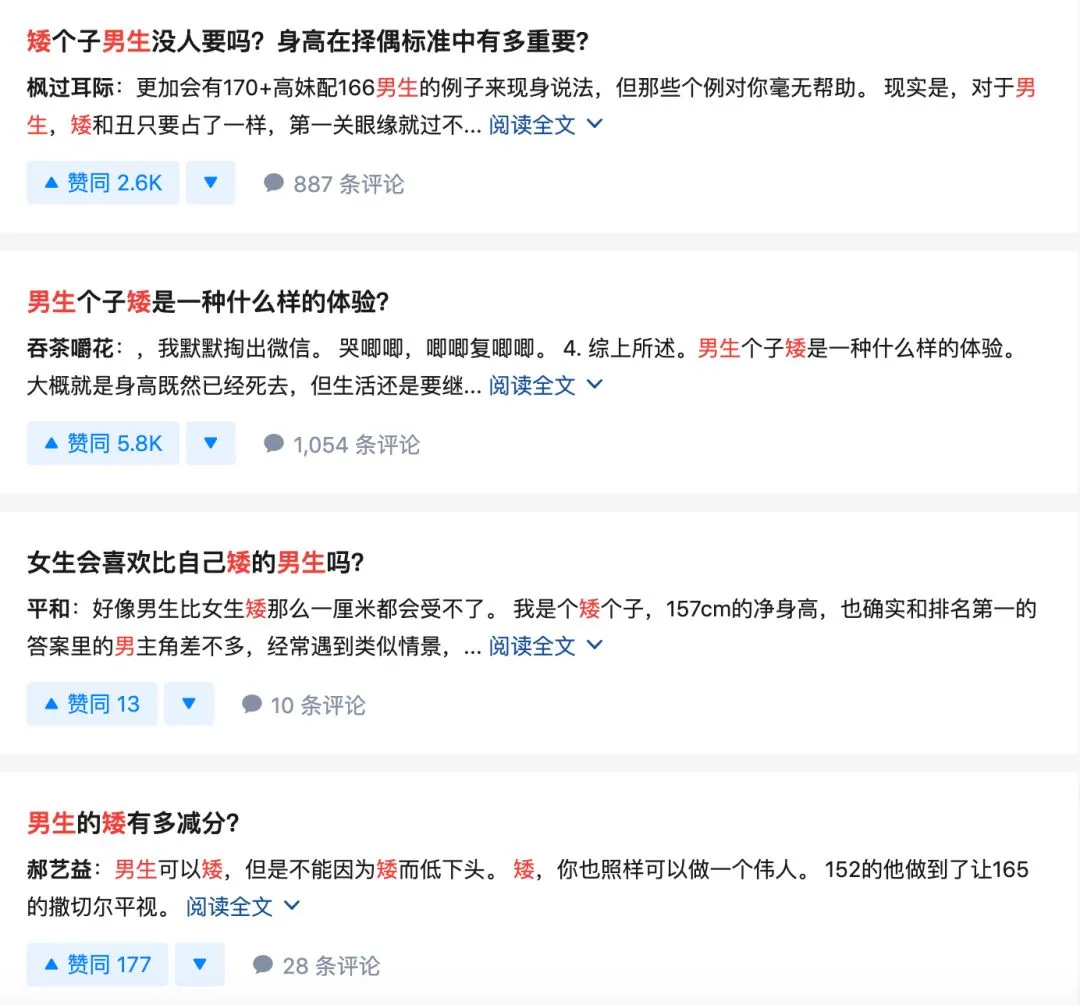 这可能是最隐形、也最常见的对男性的body shaming,在知乎上搜索“男生 矮”,看到的相关问题也大多是围绕因为身高而产生的不自信。