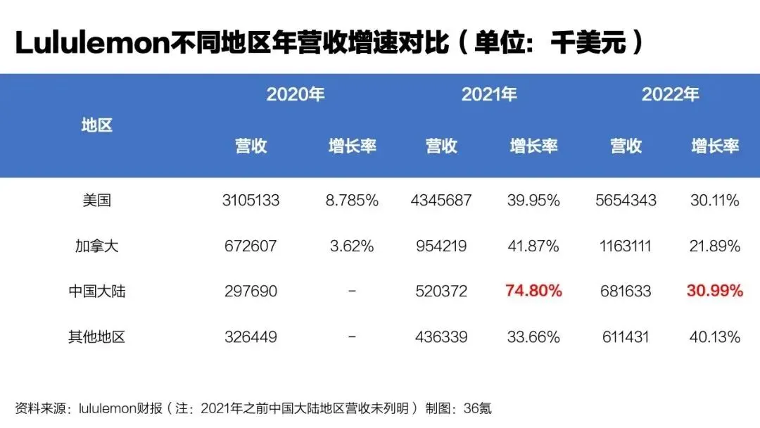 lululemon中国地区的净营收增速在2022年明显放缓,从2021年的75%直接缩水至31%,与美国市场持平。