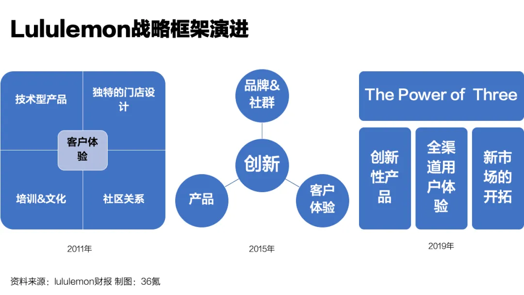 也是从2019年起,lululemon将“社区关系”“社群文化”等成名概念刨除在品牌发展框架之外,用“市场扩张”的策略取而代之。后者与“创新性产品”“全渠道用户体验”两者一道,共同构成品牌全新的Power of Three发展框架。